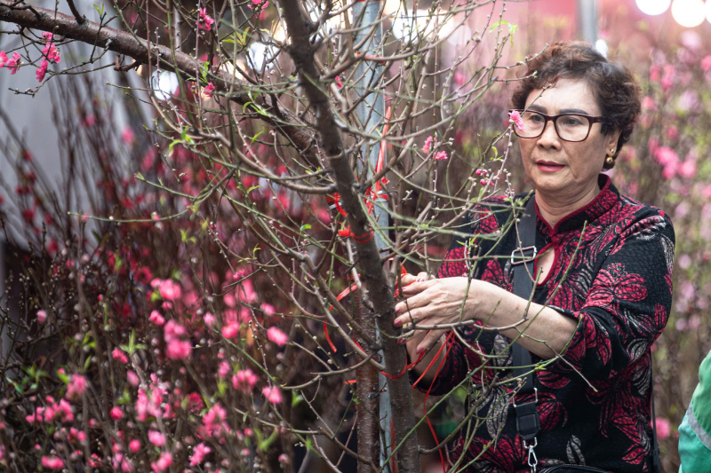 | Người dân tỉ mỉ lựa chọn, buộc dây định thế đào tại Chợ hoa Xuân phố cổ 2026 - khoảnh khắc quen thuộc của thú chơi Tết Hà Nội. |