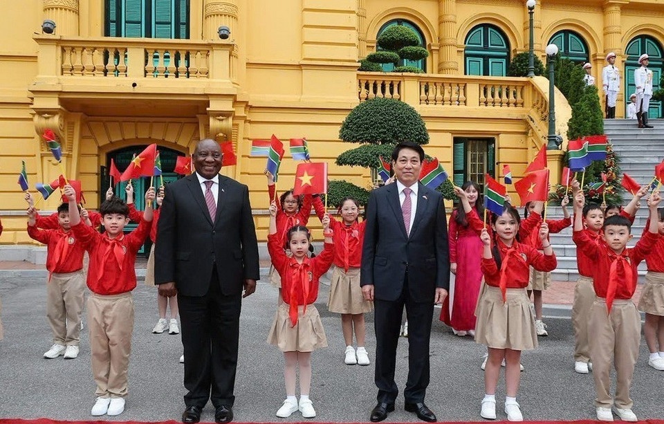Tại Phủ Chủ tịch, Chủ tịch nước Lương Cường đã chủ trì Lễ đón cấp Nhà nước Tổng thống Matamela Cyril Ramaphosa. |