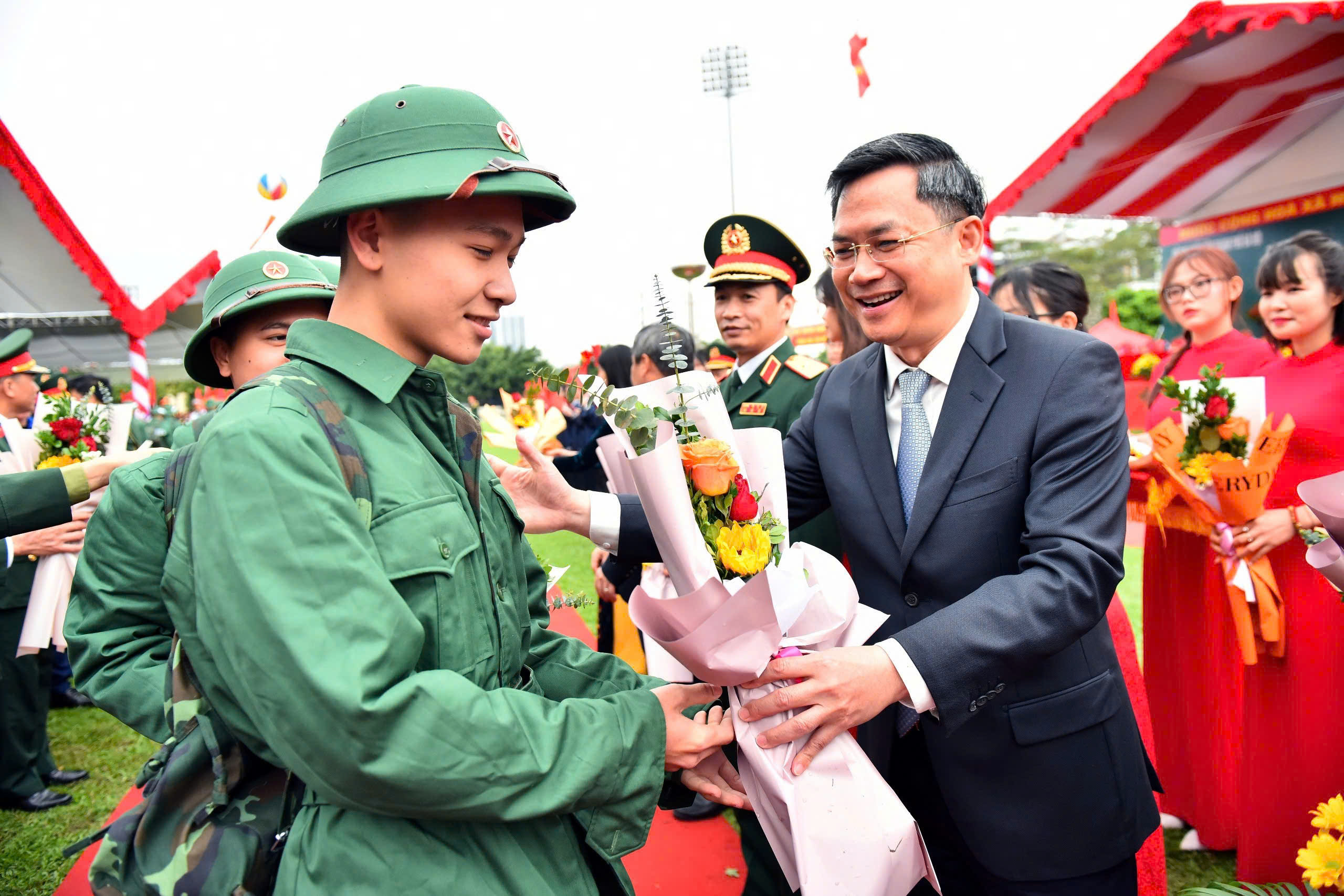 | Chủ tịch UBND TP. Hà Nội Vũ Đại Thắng tặng hoa, động viên các tân binh trước giờ lên xe về đơn vị. |