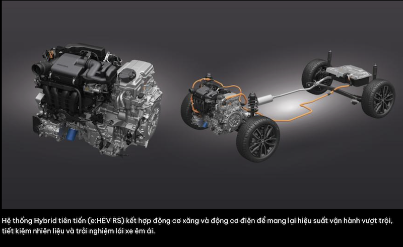 | Phiên bản e:HEV RS của HR-V sử dụng hộp số e-CVT gồm 2 mô tơ điện trong đó 1 mô tơ phát điện để tạo ra nguồn điện giúp vận hành mô tơ điện thứ 2 (mô tơ kéo) dẫn động cho xe, và sạc điện cho pin Hybrid khi cần thiết. |