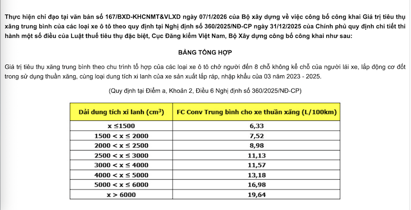 Theo công bố của Cục Đăng kiểm Việt Nam, giá trị tiêu thụ xăng trung bình theo chu trình tổ hợp của các loại xe ô tô chở người đến 8 chỗ không kể chỗ của người lái xe, lắp động cơ đốt trong sử dụng thuần xăng, cùng loại dung tích xi lanh của xe sản xuất lắp ráp, nhập khẩu của 3 năm 2023 – 2025 với dòng xe trang bị động cơ từ 1.500 cc trở xuống là 6,33 lít/100 km.