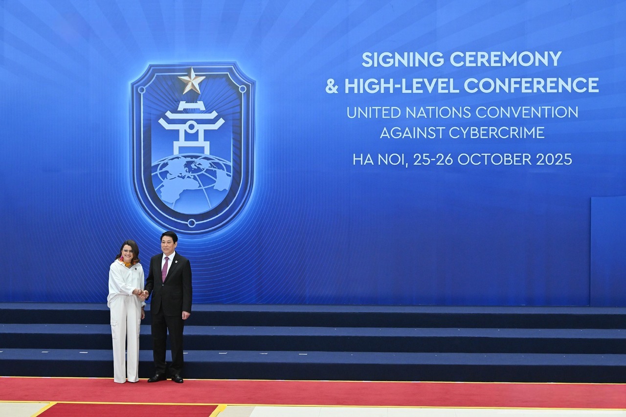 Sáng 25/10, tại Trung tâm Hội nghị quốc gia, Chủ tịch nước Lương Cường chủ trì lễ đón các Trưởng đoàn dự Lễ mở ký và Hội nghị cấp cao Công ước Liên hợp quốc về chống tội phạm mạng (Công ước Hà Nội).