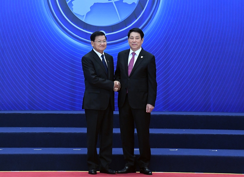 | Chủ tịch nước Lương Cường đón Tổng Bí thư, Chủ tịch nước Lào Thongloun Sisoulith tới dự Lễ mở ký. |