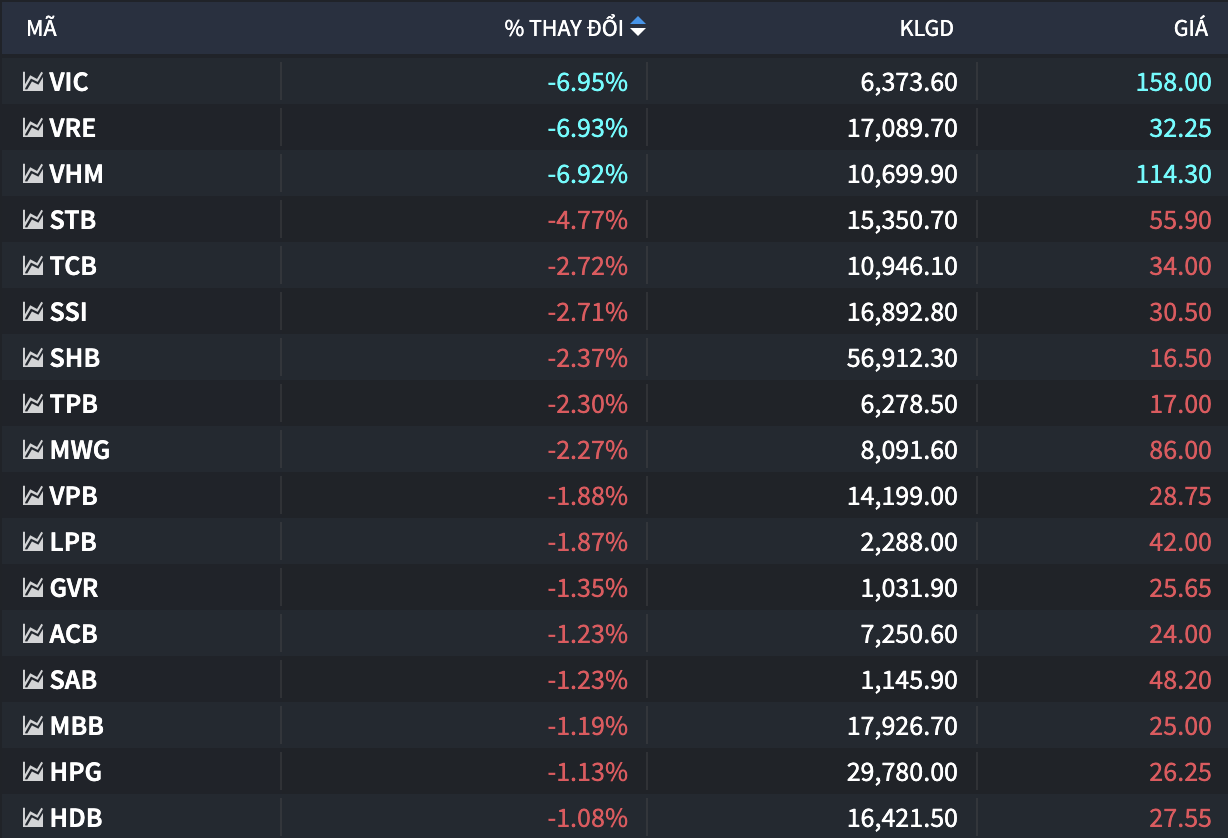 | Những mã cổ phiếu lớn trong VN30 giảm điển phiên 25/12 |
