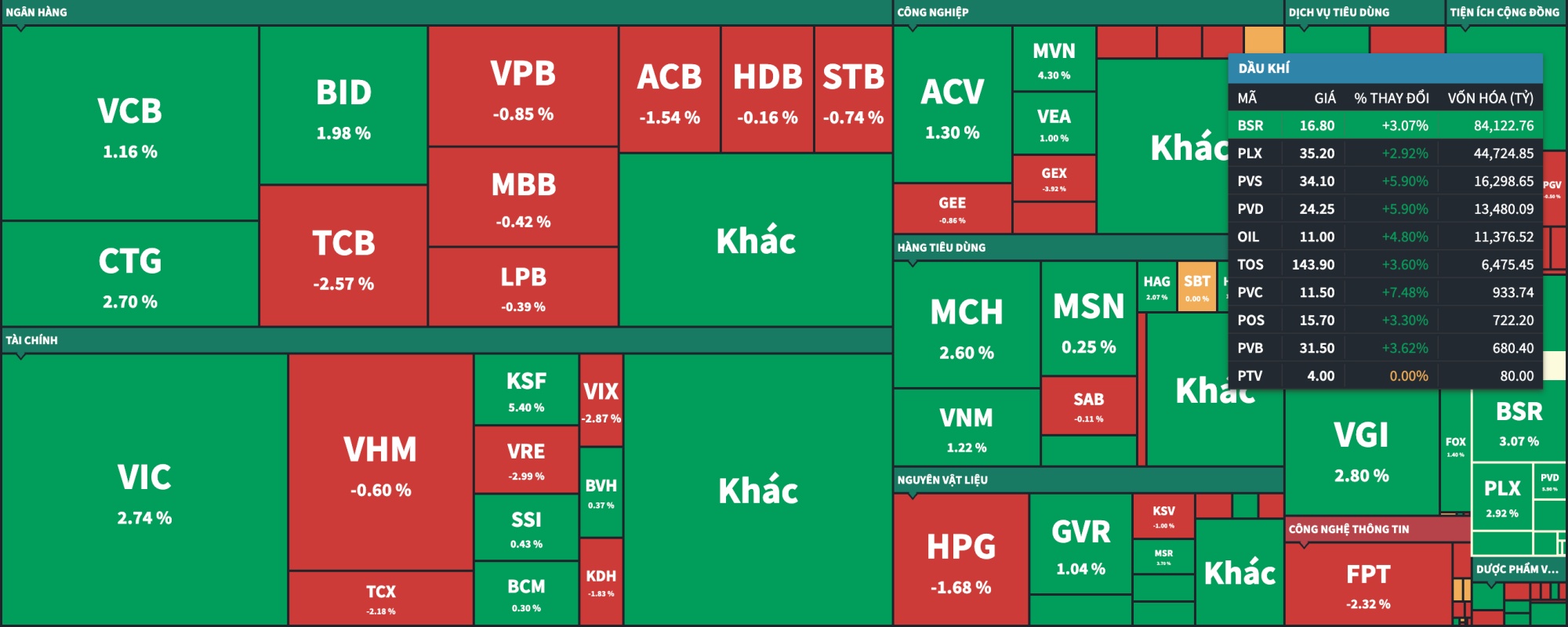 VN30 hôm nay ghi nhận 9 mã giảm trên 1%, trong đó, VRE - TCB - FPT và TPB giảm mạnh nhất với mức giảm trên 2%. Ở chiều ngược lại, GAS tăng đến 4,13%, PLX - VIC và CTG đều tăng trên 2% nhưng vẫn không đủ lực cân bằng nhóm giảm giá.
