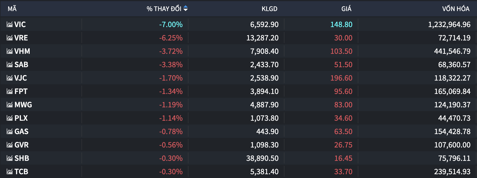 Với mức giảm lớn này, cả 4 mã nhà Vingroup đều nằm trong nhóm “đạp” chỉ số, và chỉ riêng VIC thôi đã làm chỉ số giảm hơn 19 điểm.