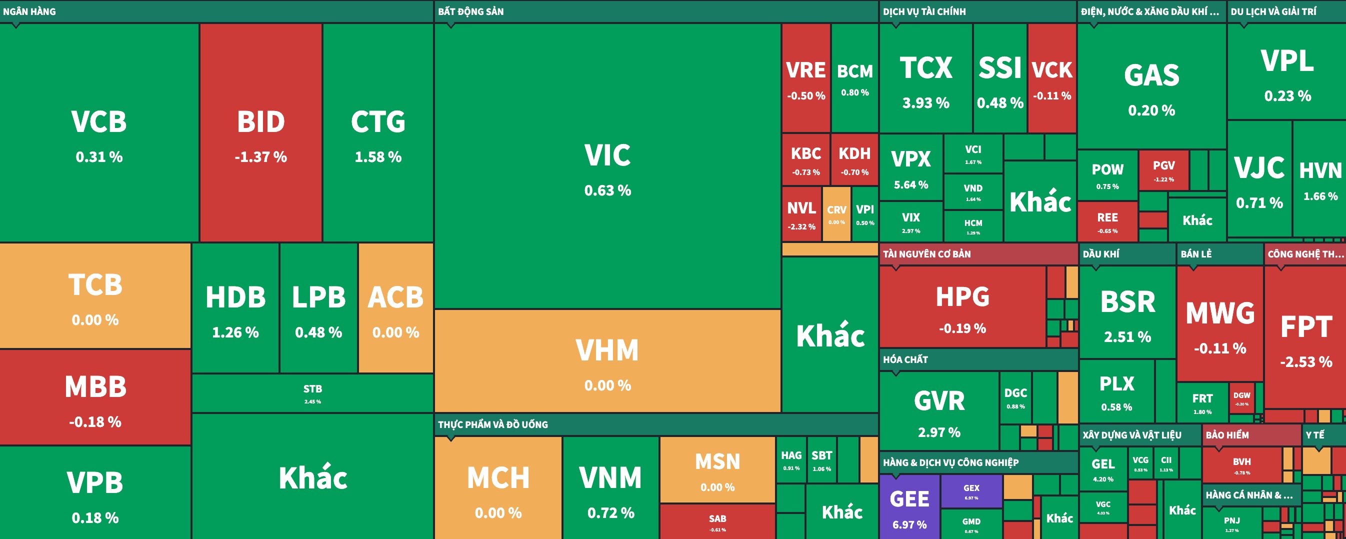 Các cổ phiếu tích cực nhất nhóm ghi tên TPB, STB, GVR khi tăng được hơn 2%. Trong khi đó, ở chiều ngược lại, FPT giảm 2,5% và BID giảm 1,37%, trở thành 2 mã ghì giá chỉ số lớn nhất.
