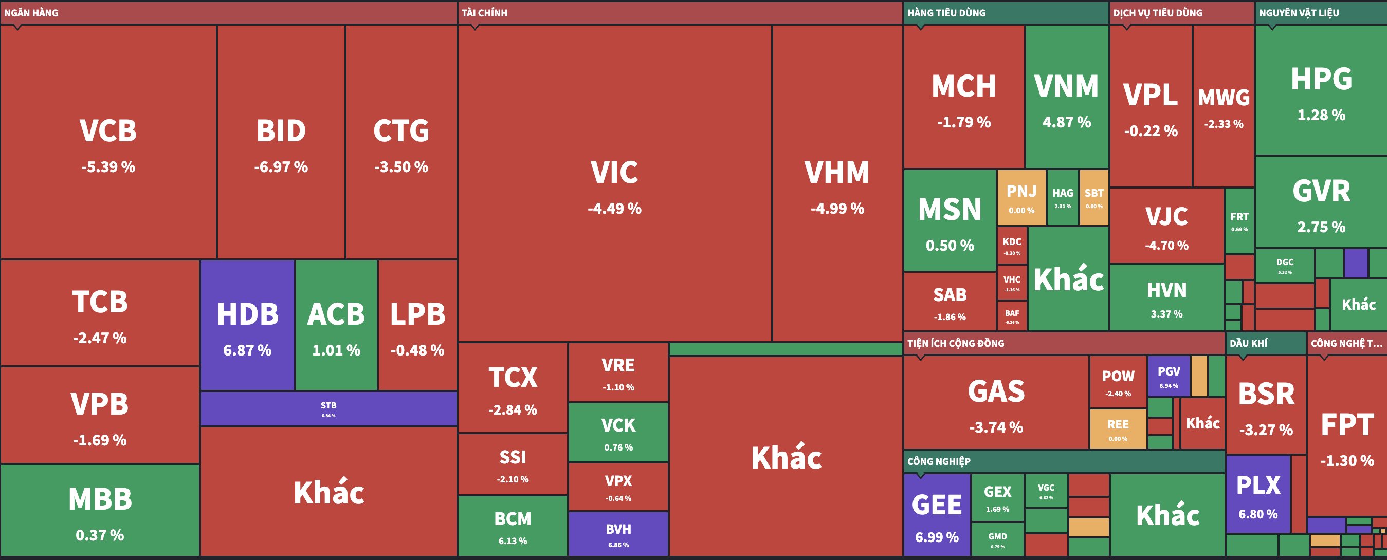 VCB cũng giảm mạnh hơn về cuối và chốt lại với việc giảm giá 5,39%. CTG cũng giảm 3,5% và GAS giảm 3,74%. Đây là những mã đã tăng liên tiếp nhiều phiên lên đỉnh lịch sử mới thời gian qua.