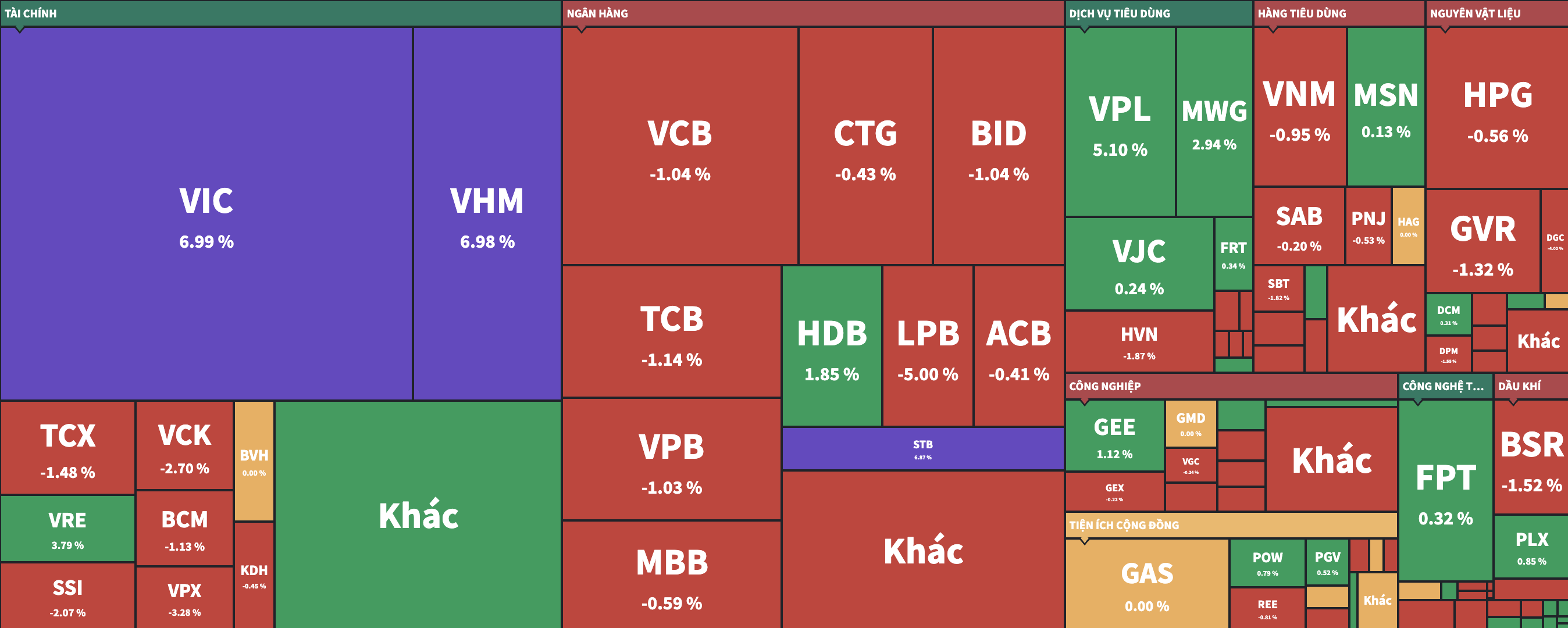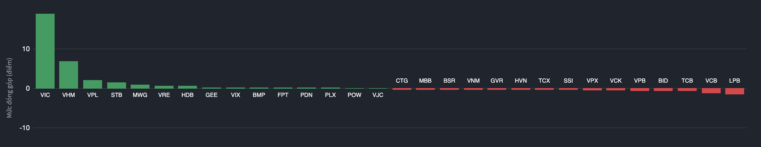 Do đó, VIC - VHM - VPL trở thành 3 mã kéo thị trường mạnh nhất và đóng góp đến 27 điểm cho chỉ số. Trên thực tế, do độ rộng hôm nay vẫn chủ yếu nghiêng về bên bán với số mã giảm nhiều hơn hẳn, nên nếu như không có sự tăng giá của 3 mã cổ phiếu này, VN-Index có nguy cơ đối diện một phiên giảm điểm thay vì tăng mạnh như hôm nay.