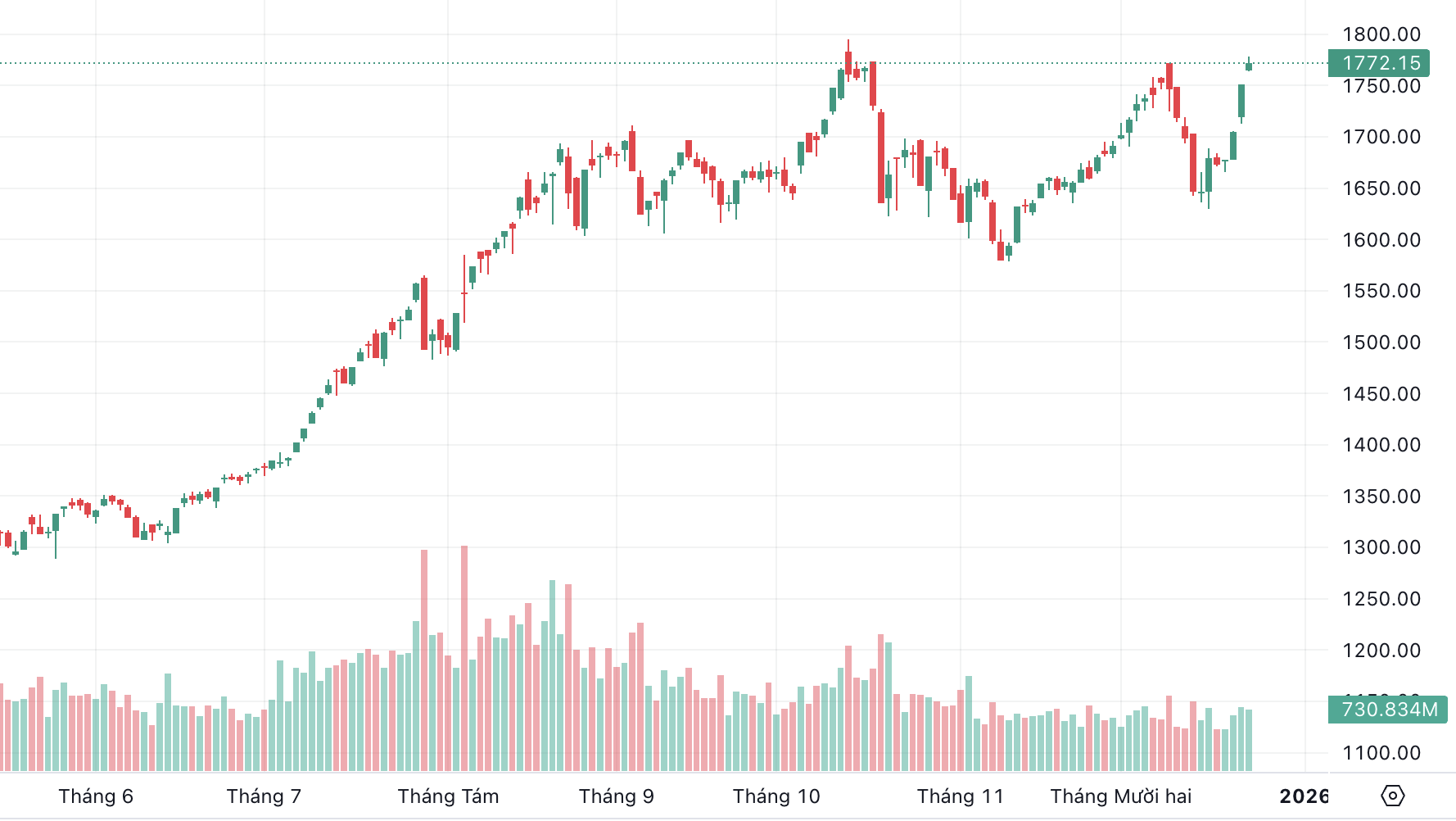 Chỉ số VN-Index hôm nay tiếp tục có một phiên tăng tốt. Đóng cửa phiên 23/12, VN-Index tăng 21,12 điểm, tương ứng tăng 1,21% lên 1.772,15 điểm. Nếu tính theo mức giá đóng cửa, đây là mức đỉnh lịch sử mới của VN-Index.