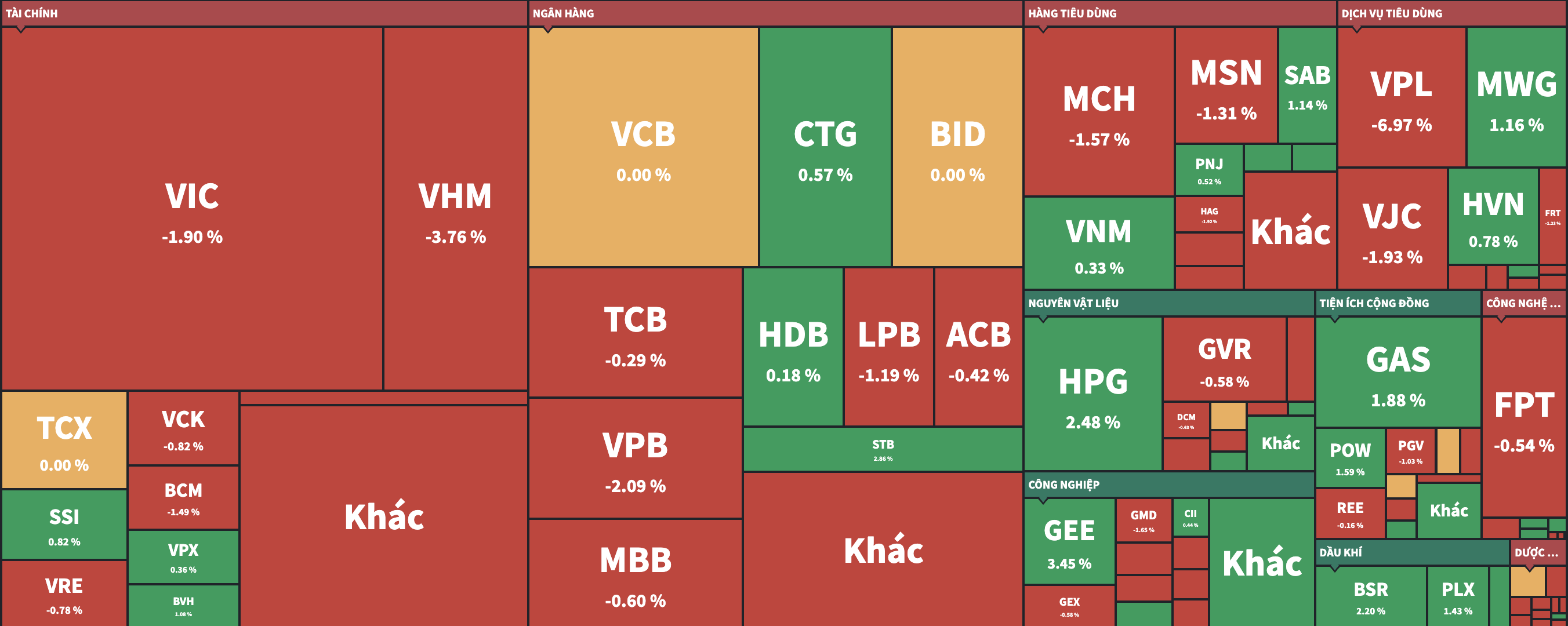 Chỉ đến khi dòng tiền mua vào trở lại trong phiên chiều, đưa nhóm Vingroup thoát cảnh nằm sàn, các mã vốn hoá lớn khác cũng hồi phục thì chỉ số mới phần nào tích cực hơn. Cả nhóm chỉ còn VPL vẫn đang bị bán sàn cho đến cuối ngày, còn lại VIC - VRE và VHM đều quay trở lại giá đỏ với biên độ giảm được thu hẹp, thậm chí còn về mức không giảm quá lớn. Cụ thể, VHM còn giảm 3,76%, VIC chỉ còn giảm 1,9%, VRE đảo chiều mạnh hơn khi từ giá sàn đã thu về chỉ còn giảm 0,78%.