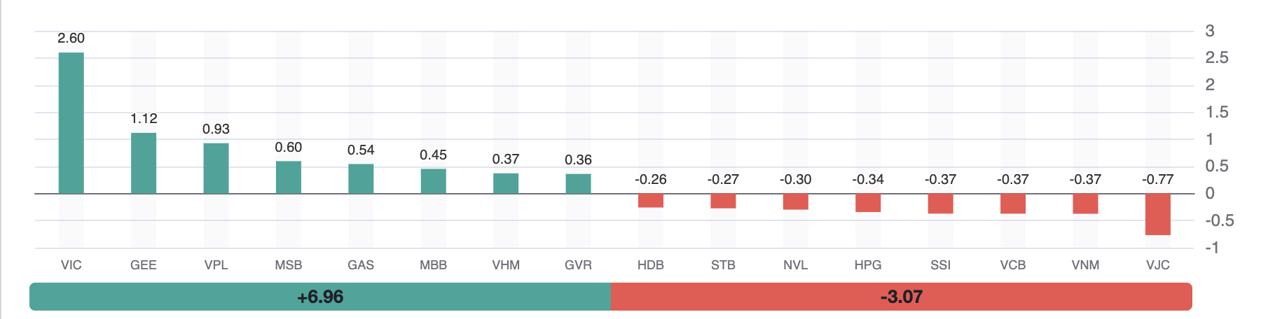 Độ rộng thị trường tích cực đầu phiên đưa chỉ số có lúc tăng được gần 15 điểm, tuy nhiên càng về cuối ngày, dòng tiền phân hoá mạnh hơn tạo nên độ cân bằng đáng kể giữa bên mua và bên bán, chỉ số thu hẹp đà tăng và chỉ nhích nhẹ 0,24%.
