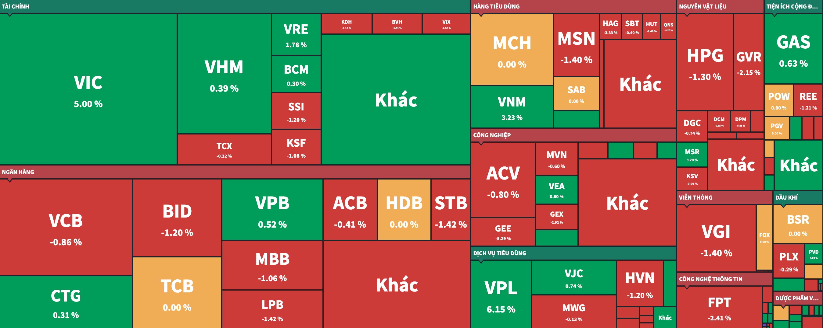 VIC và VPL trở thành 2 trụ chính cho chỉ số, bất chấp sắc đỏ vẫn chiếm đa số trên thị trường. Ở VN30, loạt cổ phiếu lớn đã yếu đi và chỉ hồi lại nhờ phiên ATC, đưa sắc xanh tăng lên 10 mã, dù vậy phần lớn vẫn chỉ tăng nhẹ dưới 1%.