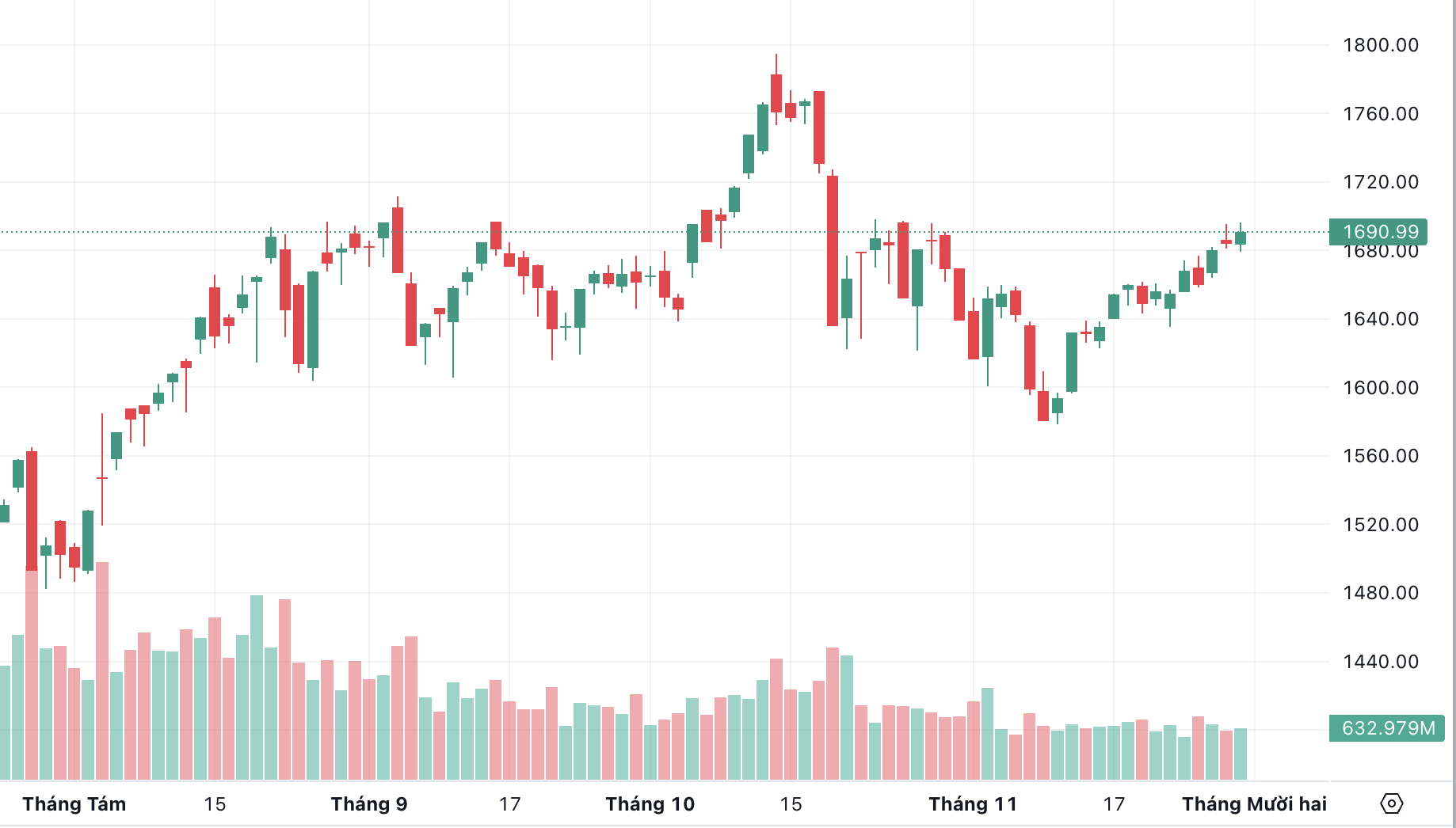 | VN-Index vượt lên mức 1.690 điểm trong phiên 28/11. |