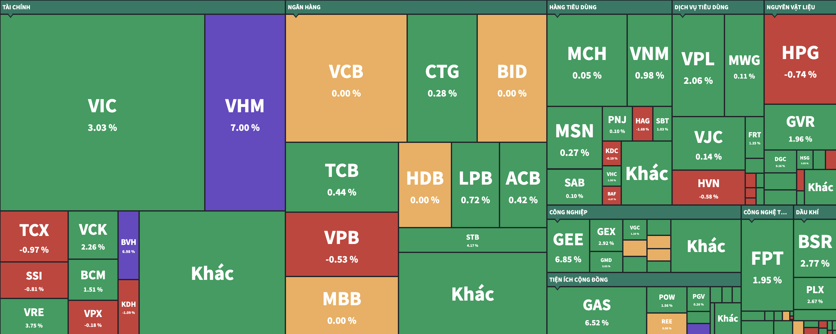 Nhờ đó, thay vì là “tội đồ” ghì chỉ số, các mã này quay đầu lại gánh điểm chính cho VN-Index. VIC - VHM - VPL - VRE đóng góp 4 vị trí trong nhóm 10 mã ảnh hưởng tích cực nhất. Trong đó, VIC và VHM đóng góp đến hơn 14 điểm vào chỉ số.