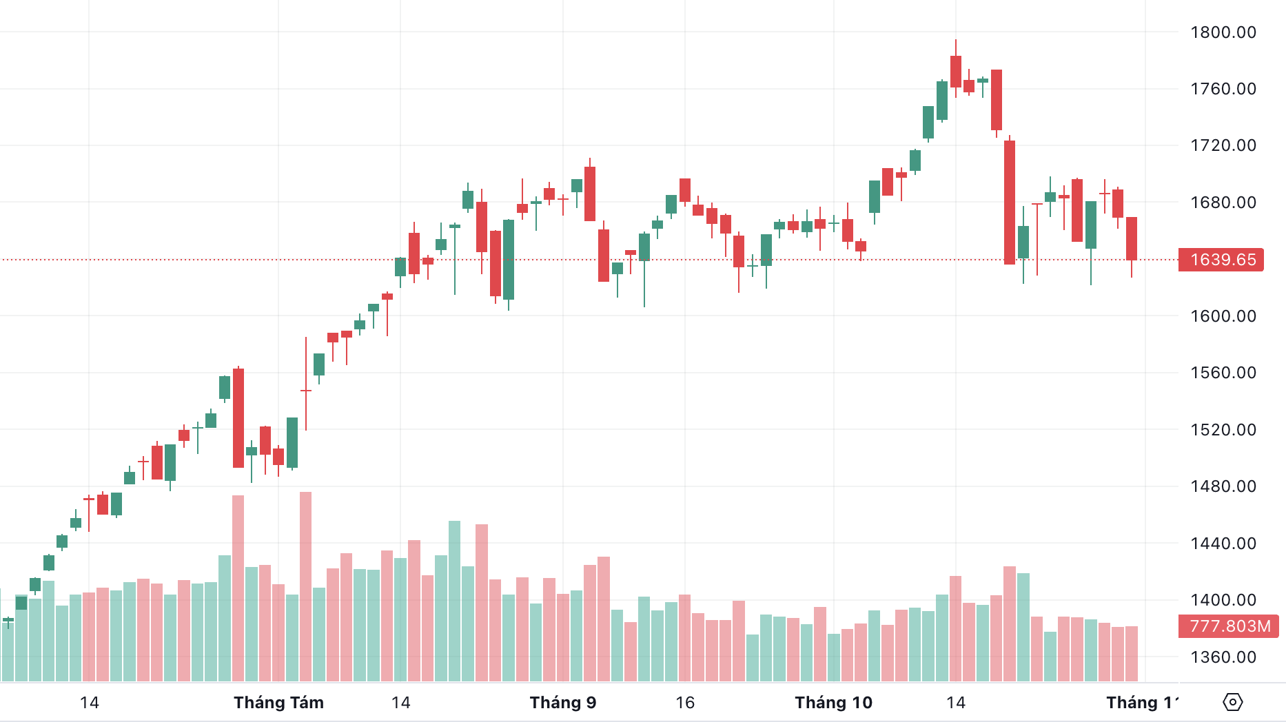 Kết phiên giao dịch hôm nay (31/10), VN-Index đóng cửa ở 1.639,65 điểm, giảm 29,92 điểm, tương đương -1,79%. Ở góc nhìn tích cực hơn, chỉ số đã có sự hồi phục nhẹ trong những phút cuối ngày và không dừng lại ở mức điểm thấp nhất. Chỉ số lúc có lúc thậm chí đã mất đến 42 điểm vào 14h30 phút, chạm 1.626,86 điểm.