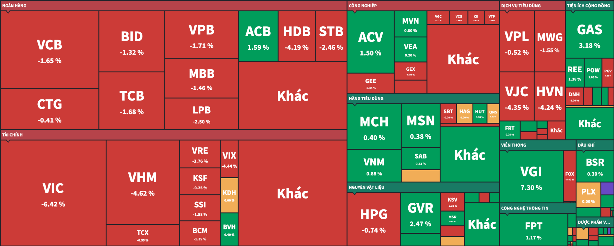 Chỉ số hôm nay vẫn bị ghì chủ yếu do nhóm cổ phiếu lớn. Đáng chú ý là VIC đã mất mốc 200.000 đồng/cổ phiếu, rơi xuống 191.000 đồng sau phiên giảm đến 6,42% hôm nay. Đây là phiên giảm nặng nề nhất của VIC kể từ đầu tháng 6/2025 đến nay.