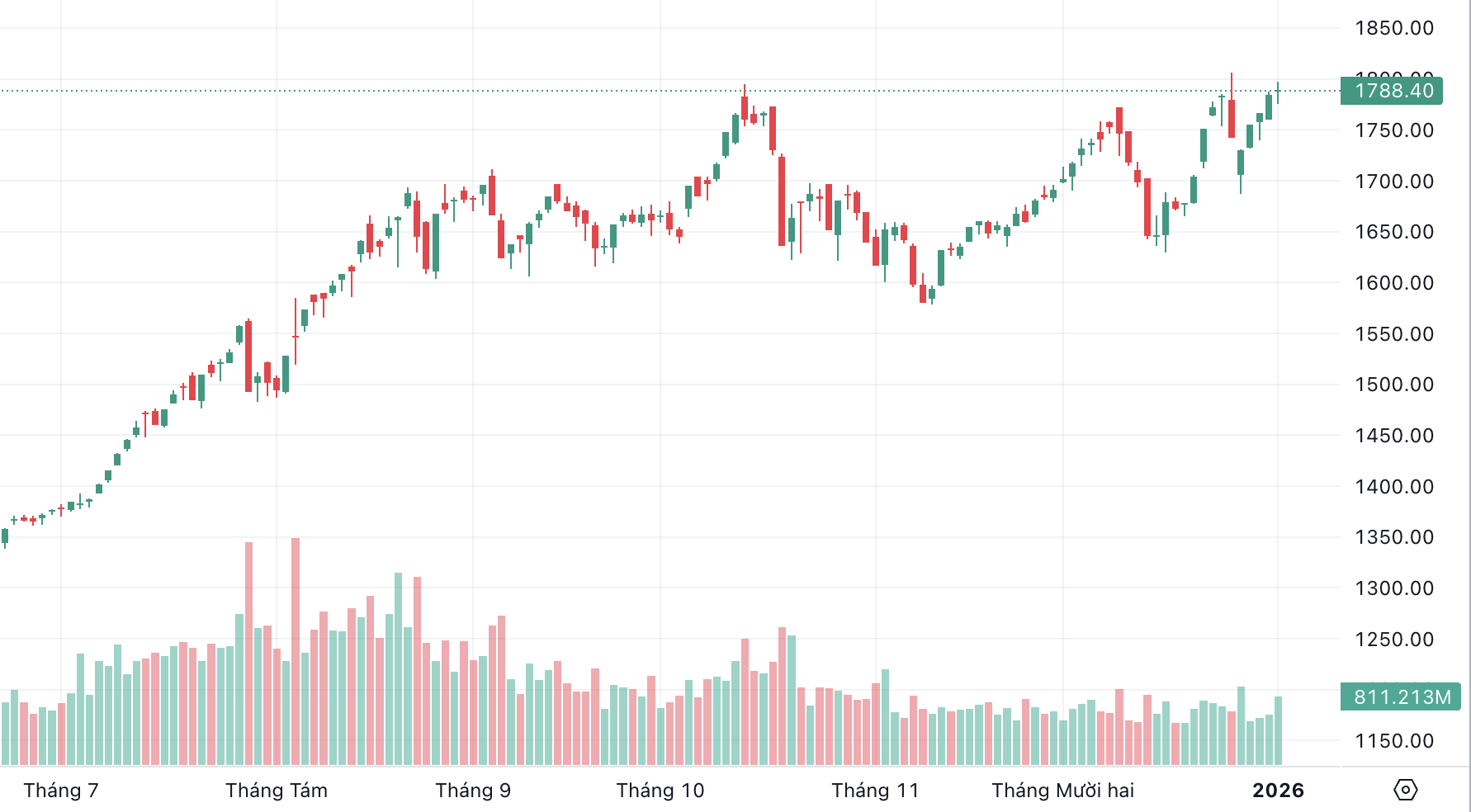 Thị trường khởi đầu năm 2026 với tâm lý lạc quan. Chỉ số khởi đầu tăng điểm và nhanh chóng tăng tốc lên tiệm cận mốc 1.800 trong 30 phút giao dịch đầu. Đóng góp chính cho điểm số chung là nhóm cổ phiếu Vingroup với sự dẫn dắt của mã VHM.