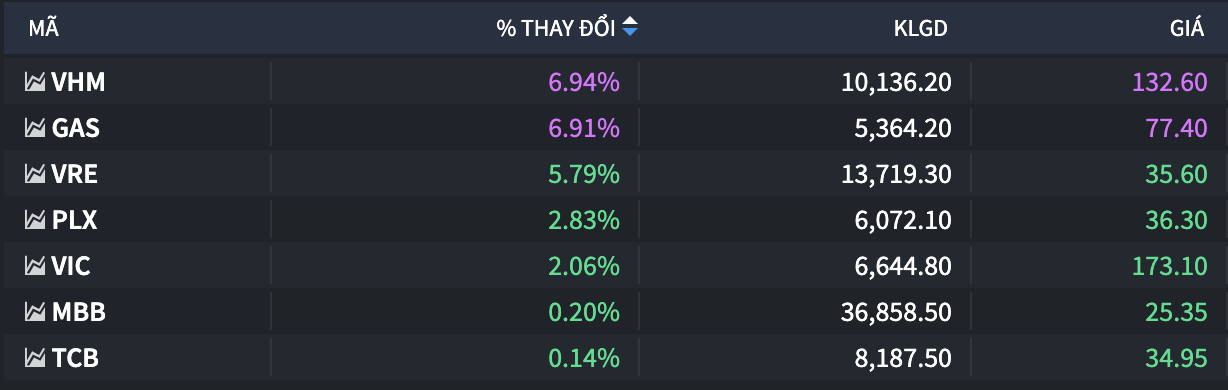 Tuy nhiên, sắc đỏ áp đảo trong rổ VN30 cùng lực cung mạnh ở một số mã blue-chips như HDB, STB, FPT, và MWG khiến chỉ số hụt hơi và lùi về vận động trồi sụt quanh mốc tham chiếu. Dầu khí và Điện là điểm sáng trong phiên với diễn biến tăng điểm ấn tượng ở cổ phiếu GAS, PLX, BSR, và PC1, trong đó có GAS tăng trần.