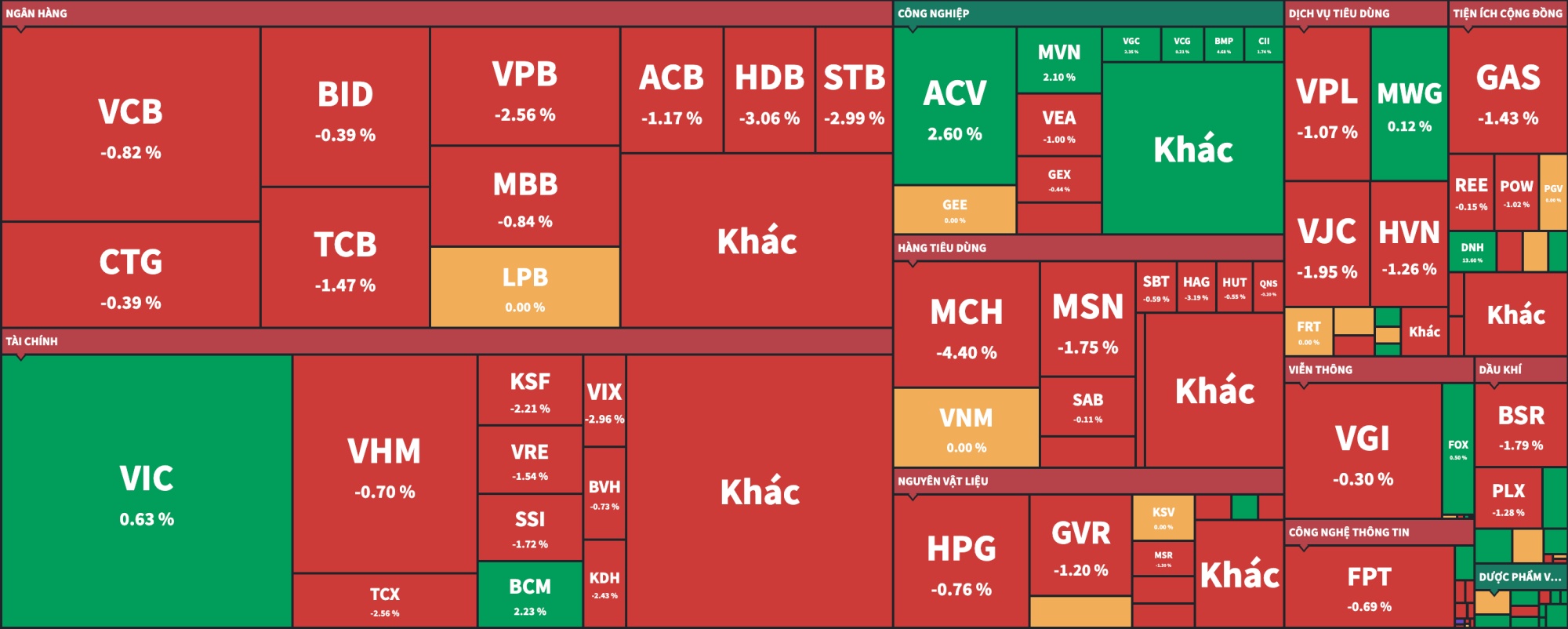 Trong khi đó, có đến 23 mã giảm giá với 14 mã giảm trên 1%. Các cổ phiếu ngân hàng mất giá mạnh nhất phiên, điểm danh HDB (-3,06%), STB (-2,99%), VPB (-2,56%), SHB (-2,16%). Sức ép từ số cổ phiếu vốn hoá lớn này khiến các cổ phiếu tăng không cân bằng kịp dù VIC vẫn là cổ phiếu ảnh hưởng tích cực nhất tới chỉ số và thanh khoản ở mã này hôm nay còn cao gấp đôi phiên hôm qua.