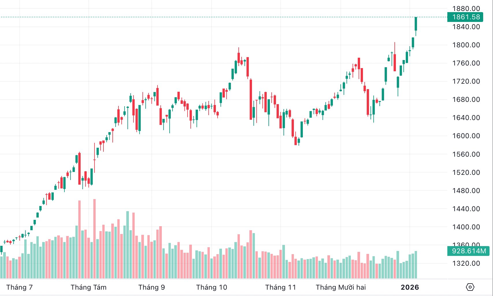 Thị trường ghi nhận dòng tiền mua tích cực trong phiên giao dịch hôm nay (07/01), đưa chỉ số tăng mạnh hơn 45,3 điểm, đóng cửa ở mức 1.861,58 điểm, tương đương tăng 2,49%.