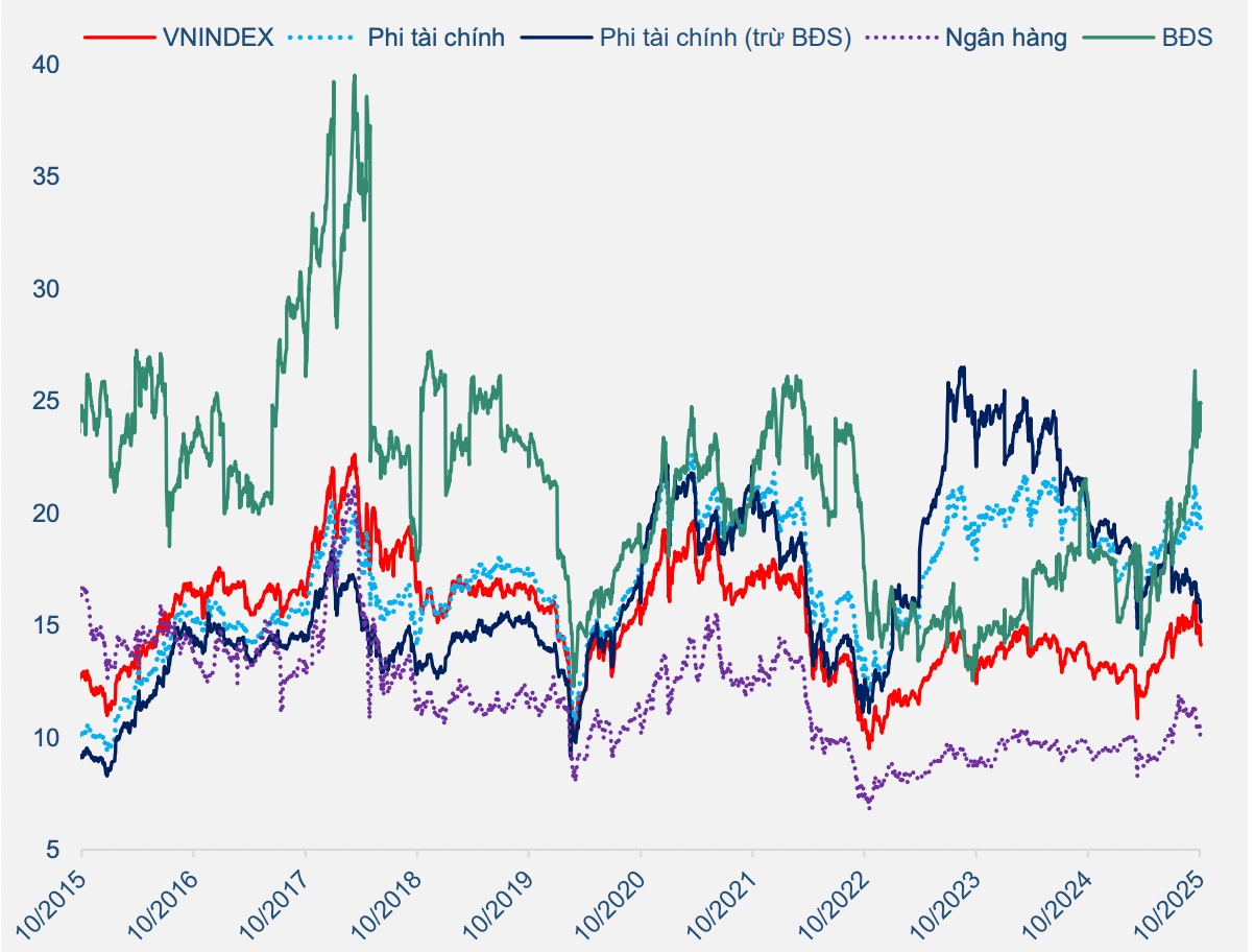 Đến cuối quý III/2025, EPS 4 quý gần nhất của VN-Index đạt khoảng 113 đồng/cổ phiếu, và dự kiến tăng lên 120-124 đồng/cổ phiếu trong quý tới. Nhờ đó, P/E thị trường đã giảm về 14,2 lần (ngày 3/11/2025).