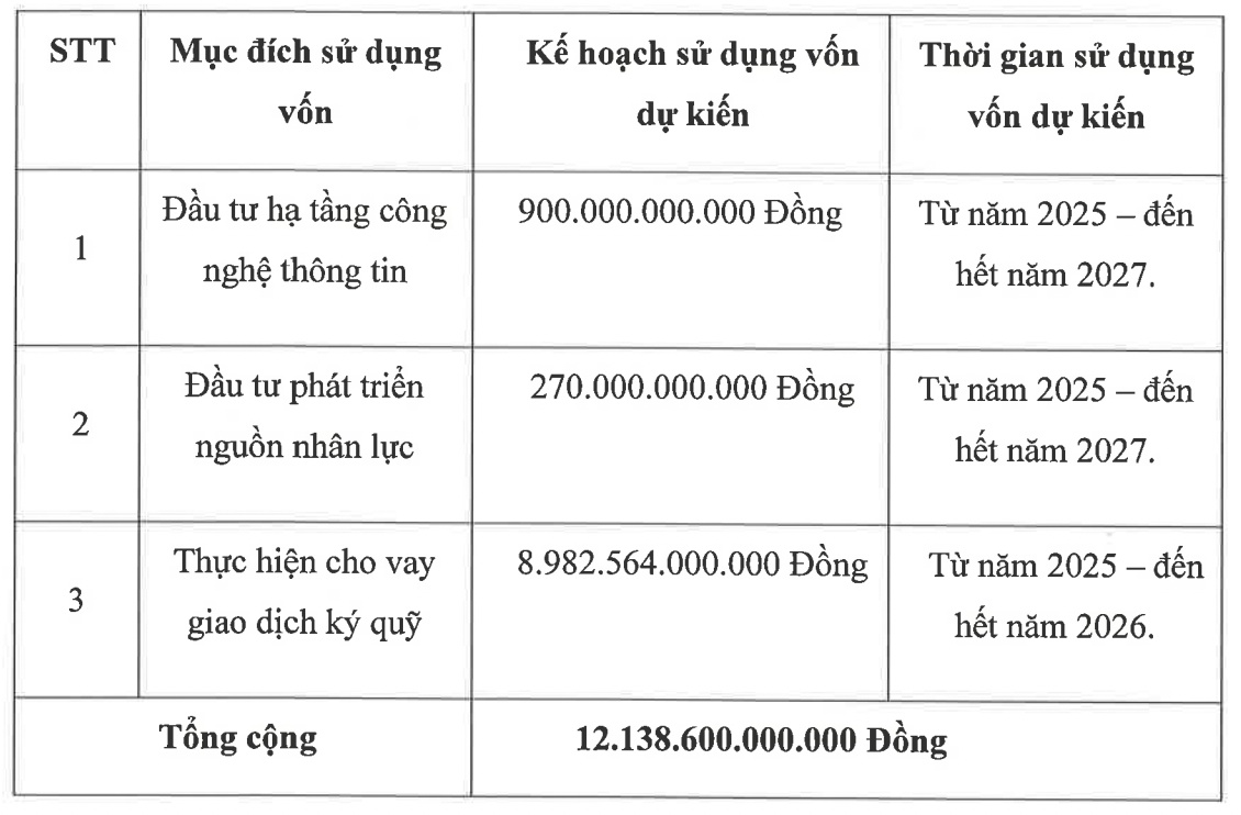 Số tiền thu được từ đợt chào bán sẽ sử dụng theo các mục đích theo thứ tự ưu tiên là Đầu tư hạ tầng công nghệ thông tin (900 tỷ đồng), Đầu tư phát triển nguồn nhân lực (270 tỷ đồng) và Thực hiện cho vay giao dịch ký quỹ (8.982 tỷ đồng). Thời gian thực hiện giải ngân từ 2025 - 2027.