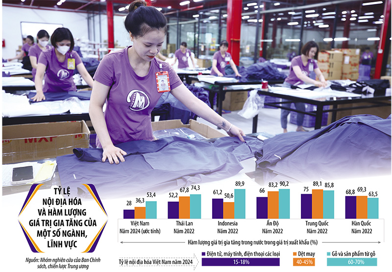 Nhưng mặt trái của mô hình gia công vẫn hiện hữu rõ nét. Năm 2024, chỉ khoảng 18% doanh nghiệp Việt Nam có kết nối với chuỗi giá trị toàn cầu, giảm 17 điểm phần trăm so với năm 2009 và chủ yếu tập trung ở nhóm doanh nghiệp lớn. Công nghiệp hỗ trợ mới chỉ đáp ứng được 10-15% nhu cầu trong nước. Phần lớn các ngành chế biến, chế tạo có độ lan tỏa cao về sản lượng, nhưng lan tỏa thấp về giá trị gia tăng và kích thích nhập khẩu mạnh - dấu hiệu điển hình của nền kinh tế gia công.