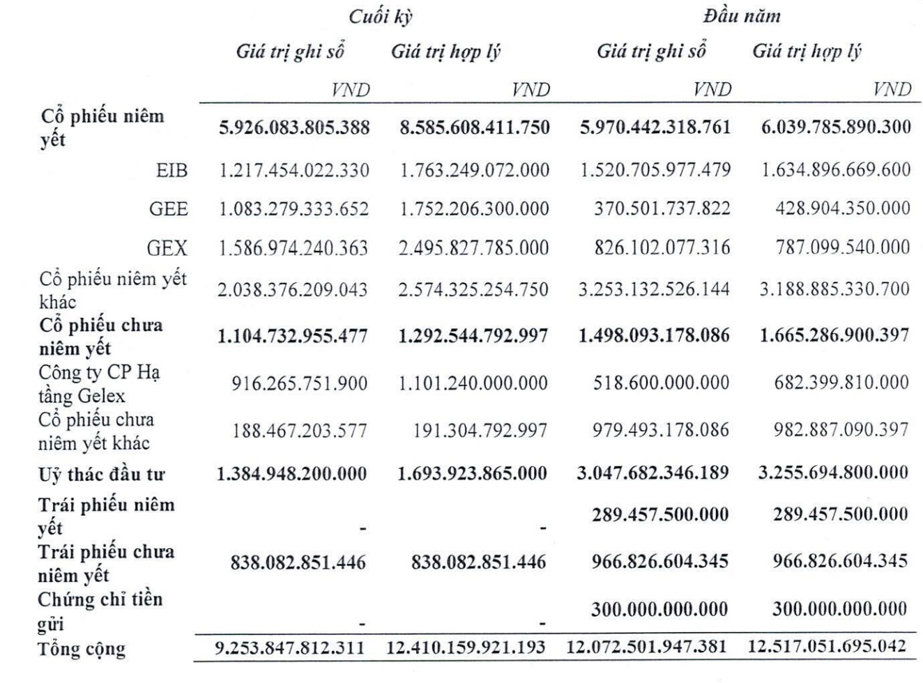Riêng giá trị đầu tư vào 3 mã EIB - GEE - GEX đã chiếm hơn 6.000 tỷ đồng, tương ứng 70% danh mục cổ phiếu niêm yết. Ngoài ra, VIX còn đầu tư 1.292 tỷ đồng vào cổ phiếu chưa niêm yết, trong đó, 1.101 tỷ đồng là cổ phiếu của CTCP Hạ tầng Gelex.
