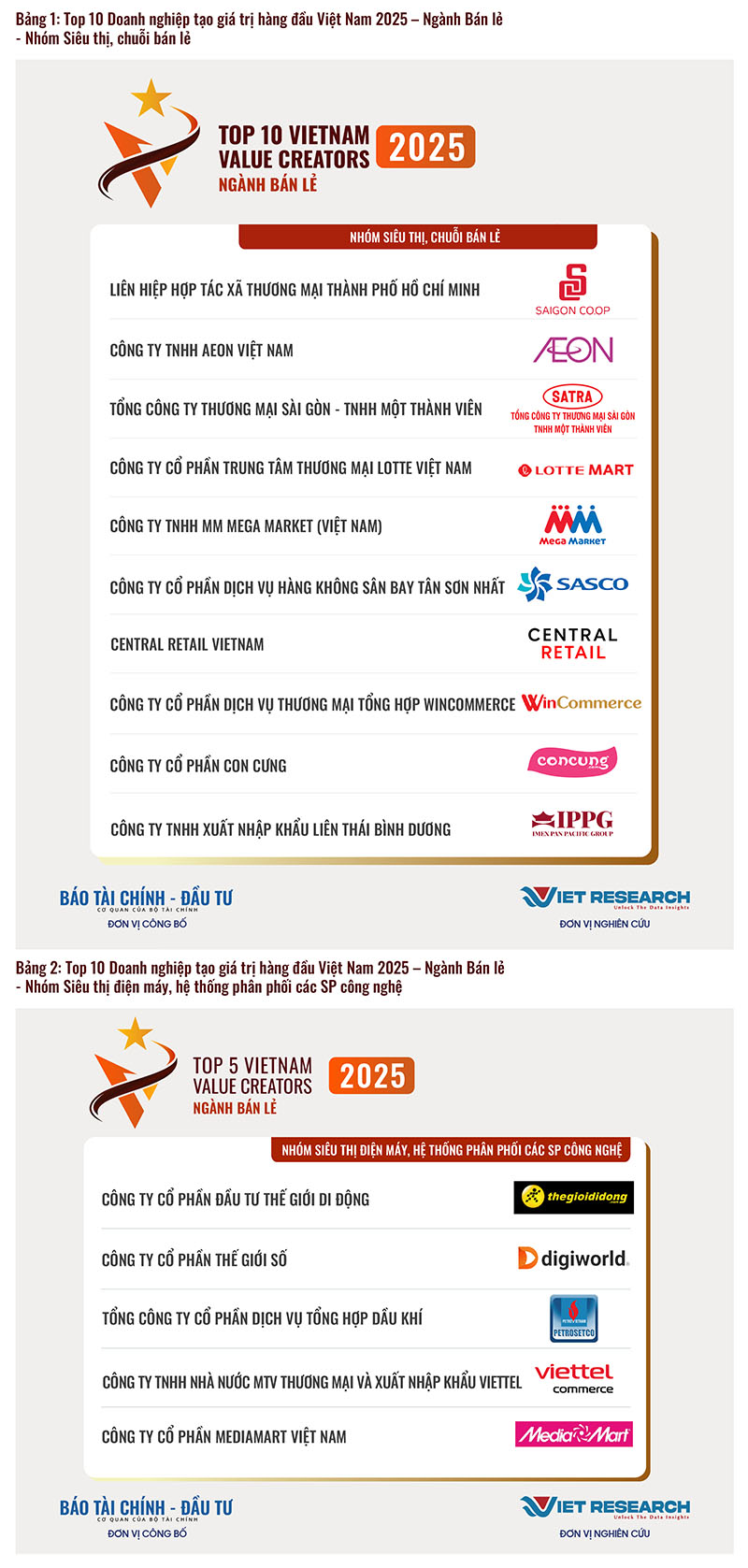 Trong khuôn khổ Chương trình Nghiên cứu toàn quốc về các Doanh nghiệp tạo giá trị hàng đầu Việt Nam, Viet Research phối hợp với Báo Tài chính - Đầu tư (Bộ Tài chính) công bố Top 10 Doanh nghiệp tạo giá trị hàng đầu Việt Nam 2025 - Ngành Bán lẻ. Đây là những doanh nghiệp tiên phong trong việc tạo dựng giá trị cho nền kinh tế và xã hội, thể hiện qua: quy mô và tốc độ tăng trưởng; lợi nhuận và đóng góp cho ngân sách; môi trường, chính sách và phúc lợi lao động; cam kết về ESG và đổi mới sáng tạo.