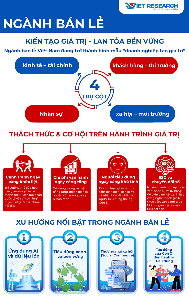 Nhìn chung, để bứt phá, doanh nghiệp bán lẻ không thể chỉ dừng lại ở việc cạnh tranh bằng quy mô hay giá cả, mà phải biết tạo ra giá trị đa chiều. Một mô hình bán lẻ thành công trong thập niên tới sẽ là mô hình vừa đạt hiệu quả kinh tế, vừa gắn kết khách hàng bằng trải nghiệm, nâng tầm nhân sự thông qua chính sách nhân văn, và lan tỏa trách nhiệm xã hội thông qua các sáng kiến ESG. Khi hội tụ được những yếu tố này, doanh nghiệp bán lẻ Việt Nam mới thực sự tạo ra lợi thế cạnh tranh dài hạn, góp phần đưa ngành Bán lẻ trở thành trụ cột của nền kinh tế số và xã hội tiêu dùng bền vững.