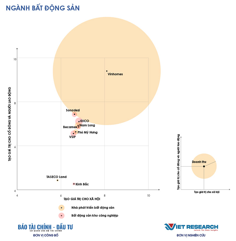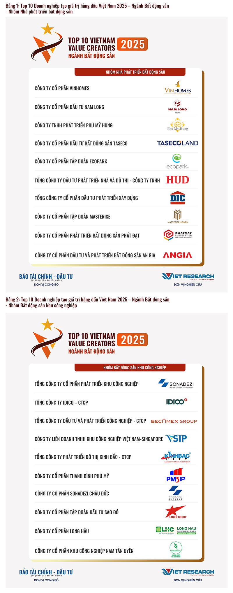 Trong khuôn khổ Chương trình Nghiên cứu toàn quốc về các Doanh nghiệp tạo giá trị hàng đầu Việt Nam, Viet Research phối hợp với Báo Tài chính - Đầu tư (Bộ Tài chính) công bố Top 10 Doanh nghiệp tạo giá trị hàng đầu Việt Nam 2025 - Ngành Bất động sản. Đây là những doanh nghiệp tiên phong trong việc tạo dựng giá trị cho nền kinh tế và xã hội, thể hiện qua: quy mô và tốc độ tăng trưởng; lợi nhuận và đóng góp cho ngân sách; môi trường, chính sách và phúc lợi lao động; cam kết về ESG và đổi mới sáng tạo.