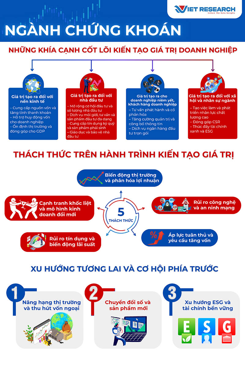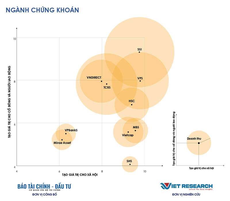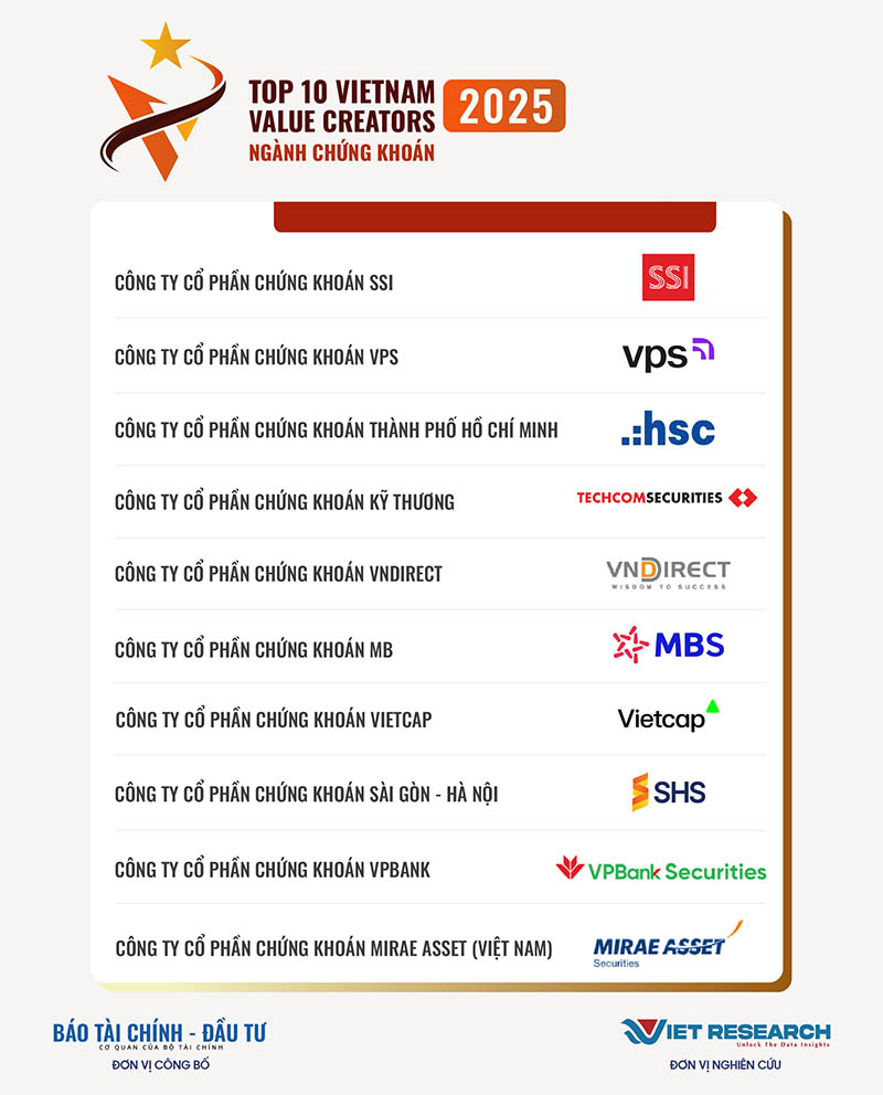 Trong khuôn khổ Chương trình Nghiên cứu toàn quốc về các Doanh nghiệp tạo giá trị hàng đầu Việt Nam, Viet Research phối hợp với Báo Tài chính - Đầu tư (Bộ Tài chính) công bố Top 10 Doanh nghiệp tạo giá trị hàng đầu Việt Nam 2025 – Ngành chứng khoán. Đây là những doanh nghiệp tiên phong trong việc tạo dựng giá trị cho nền kinh tế và xã hội, thể hiện qua: quy mô và tốc độ tăng trưởng; lợi nhuận và đóng góp cho ngân sách; môi trường, chính sách và phúc lợi lao động; cam kết về ESG và đổi mới sáng tạo.