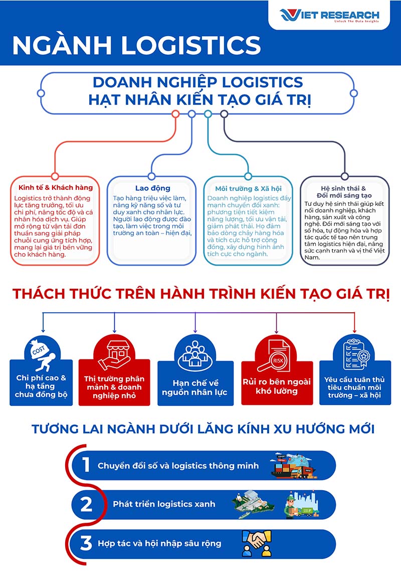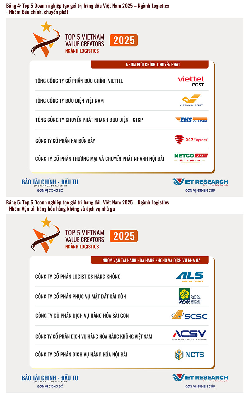 Trong khuôn khổ Chương trình Nghiên cứu toàn quốc về các Doanh nghiệp tạo giá trị hàng đầu Việt Nam, Viet Research phối hợp với Báo Tài chính - Đầu tư (Bộ Tài chính) công bố Top 10 Doanh nghiệp tạo giá trị hàng đầu Việt Nam 2025 - Ngành Logistics. Đây là những doanh nghiệp tiên phong trong việc tạo dựng giá trị cho nền kinh tế và xã hội, thể hiện qua: quy mô và tốc độ tăng trưởng; lợi nhuận và đóng góp cho ngân sách; môi trường, chính sách và phúc lợi lao động; cam kết về ESG và đổi mới sáng tạo.