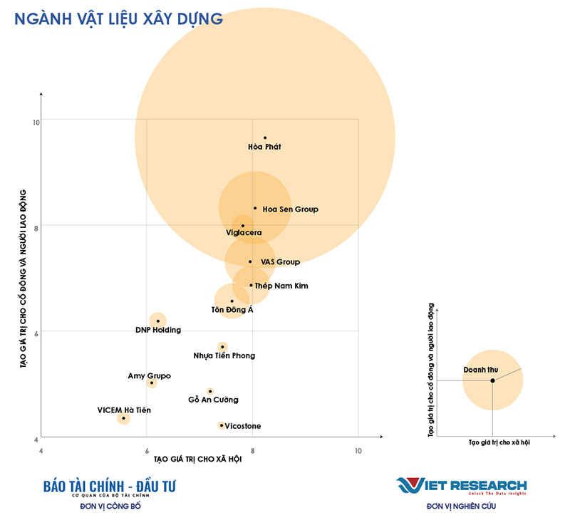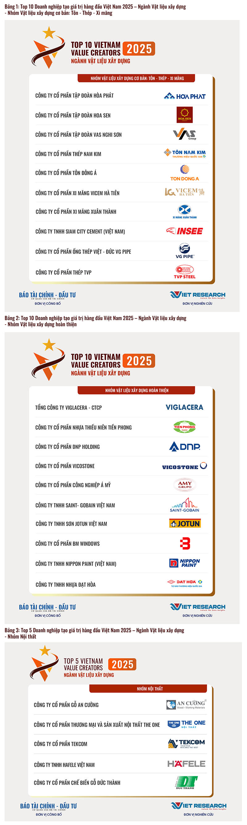 Trong khuôn khổ Chương trình Nghiên cứu toàn quốc về các Doanh nghiệp tạo giá trị hàng đầu Việt Nam, Viet Research phối hợp với Báo Tài chính - Đầu tư (Bộ Tài chính) công bố Top 10 Doanh nghiệp tạo giá trị hàng đầu Việt Nam 2025 - Ngành Vật liệu xây dựng. Đây là những doanh nghiệp tiên phong trong việc tạo dựng giá trị cho nền kinh tế và xã hội, thể hiện qua: quy mô và tốc độ tăng trưởng; lợi nhuận và đóng góp cho ngân sách; môi trường, chính sách và phúc lợi lao động; cam kết về ESG và đổi mới sáng tạo.
