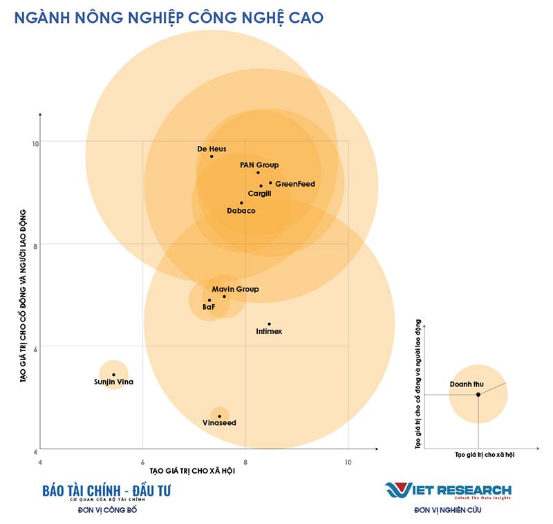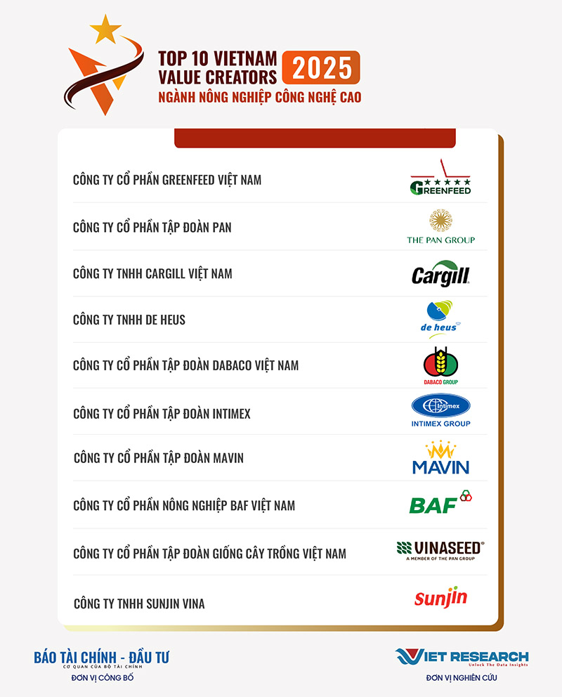 Trong khuôn khổ Chương trình Nghiên cứu toàn quốc về các Doanh nghiệp tạo giá trị hàng đầu Việt Nam, Viet Research phối hợp với Báo Tài chính - Đầu tư (Bộ Tài chính) công bố Top 10 Doanh nghiệp tạo giá trị hàng đầu Việt Nam 2025 ngành Nông nghiệp công nghệ cao. Đây là những doanh nghiệp tiên phong trong việc tạo dựng giá trị cho nền kinh tế và xã hội, thể hiện qua: quy mô và tốc độ tăng trưởng; lợi nhuận và đóng góp cho ngân sách; môi trường, chính sách và phúc lợi lao động; cam kết về ESG và đổi mới sáng tạo.