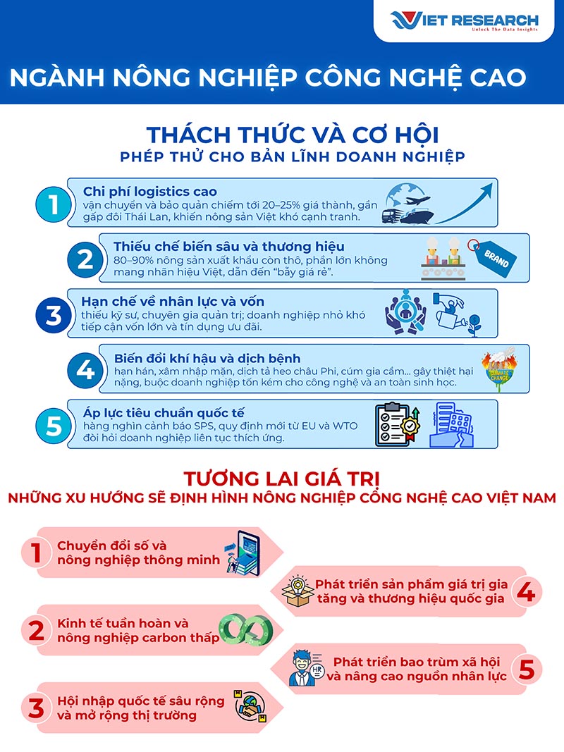 Nông nghiệp công nghệ cao Việt Nam đang bước vào giai đoạn mới - nơi cơ hội đi đôi với thách thức, nhưng quan trọng hơn cả là những xu hướng mang tính bứt phá, hứa hẹn mở ra một kỷ nguyên phát triển bền vững và toàn diện. Có 5 xu hướng chính đang định hình cách doanh nghiệp nông nghiệp công nghệ cao kiến tạo giá trị theo khảo sát và nghiên cứu của Viet Research đối với các doanh nghiệp trong Danh sách Top 10 Doanh nghiệp tạo giá trị hàng đầu Việt Nam 2025 ngành Nông nghiệp công nghệ cao.