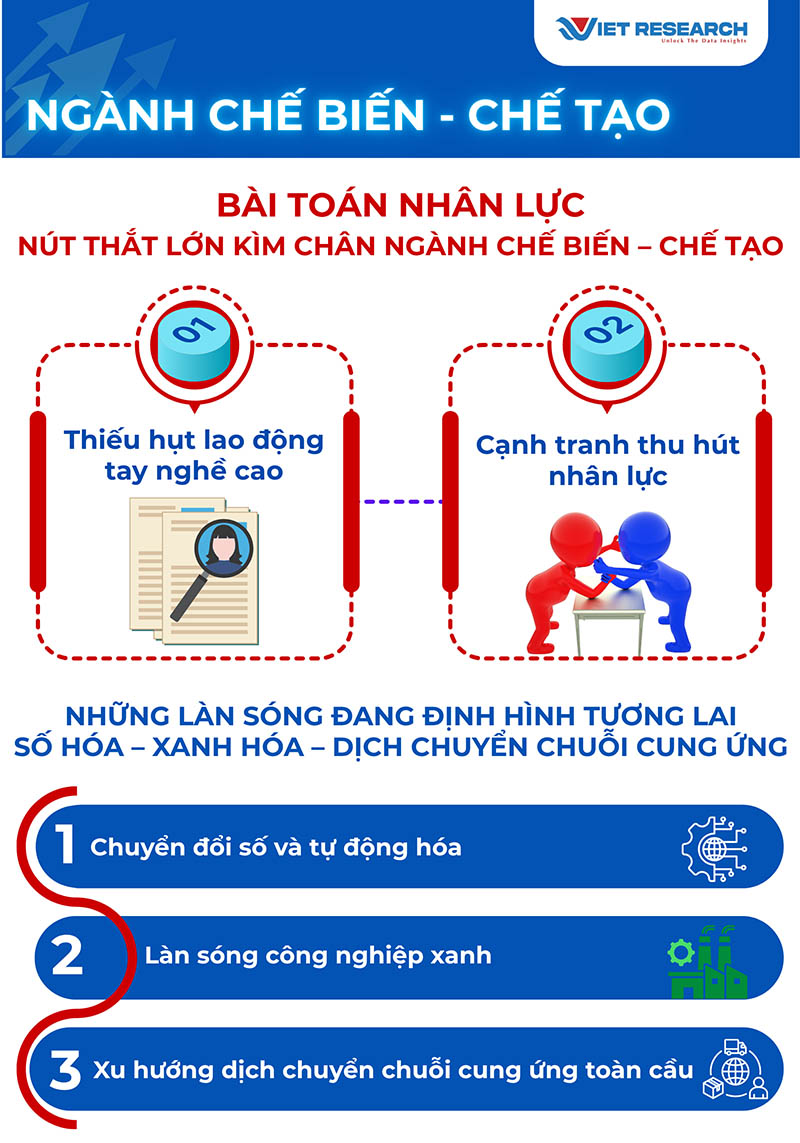 Nguyên nhân mang tính hệ thống: sản xuất đang chuyển nhanh lên giá trị cao, nhưng hệ thống đào tạo nghề - đại học chưa theo kịp; dẫn tới tình trạng “thừa lao động phổ thông, thiếu lao động chất lượng cao”. Doanh nghiệp điện tử, cơ khí, dệt may, chế tạo máy đều gặp khó khi tìm người “vừa có nghề, vừa có kỷ luật sản xuất, lại hiểu công nghệ”. Ngay cả khi thị trường hồi phục, báo cáo quý I/2025 cho thấy chỉ 11,9% doanh nghiệp tăng số lao động, nhưng nhu cầu kỹ năng cao lại nóng hơn bao giờ hết, khiến doanh nghiệp phải kéo dài thời gian tuyển dụng, tăng chi phí lương - phụ cấp hoặc tự mở các khóa đào tạo nghề cấp tốc. Về dài hạn, nếu không giải quyết bài toán kỹ năng, ngành Chế biến - Chế tạo sẽ khó leo lên nấc thang giá trị cao hơn trong chuỗi cung ứng toàn cầu.