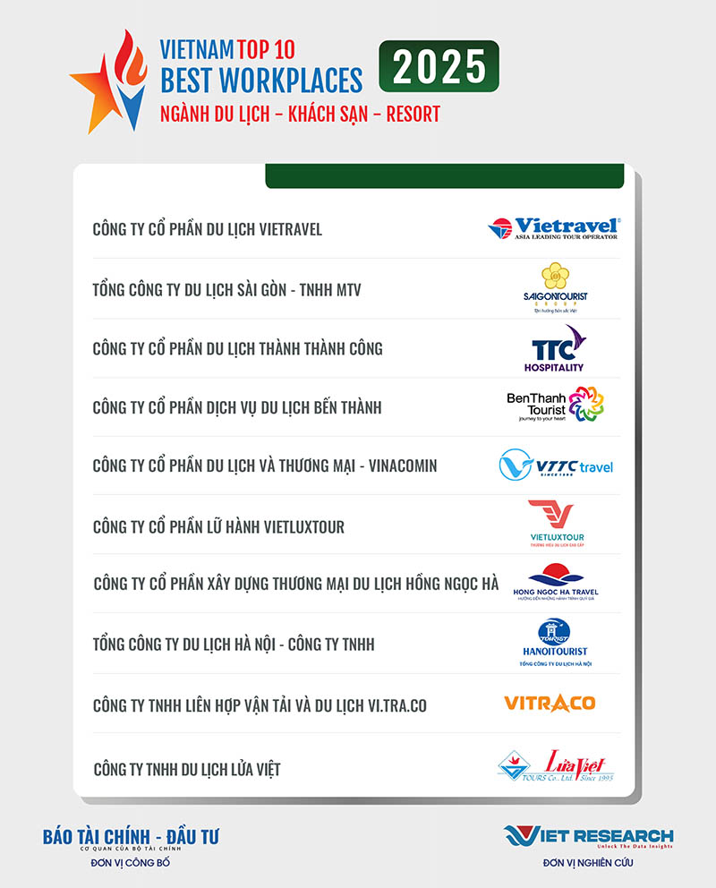 | Nguồn: Top 10 Nơi làm việc tốt nhất Việt Nam ngành Du lịch - Khách sạn - Resort (https://vbw10.vn/) |