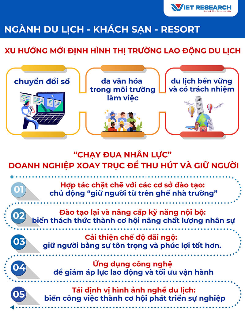Cùng với những thách thức trên, thị trường lao động du lịch - khách sạn - resort đang vận động theo một số xu hướng mới đáng chú ý. Du lịch bước vào giai đoạn mới - giai đoạn của số hóa, của tính đa văn hóa và của trải nghiệm bền vững. Cùng với đó, lực lượng lao động cũng phải thay đổi để thích ứng.