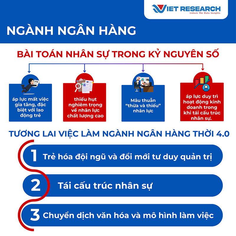 Dù thị trường lao động ngân hàng đang trải qua nhiều biến động ngắn hạn, bức tranh dài hạn vẫn đầy triển vọng nếu cả doanh nghiệp và người lao động chủ động thích ứng. Ngành Ngân hàng không “thu hẹp” như những con số cắt giảm nhân sự cho thấy, mà đang tái định hình chiến lược con người để phù hợp với kỷ nguyên số, khi công nghệ trở thành trụ cột vận hành mới. Theo khảo sát và nghiên cứu từ Top 10 Nơi làm việc tốt nhất Việt Nam – Ngành Ngân hàng của Viet Research, có 3 xu hướng lớn đang định hình diện mạo mới của lực lượng lao động ngành Ngân hàng trong giai đoạn tới, trong đó nổi bật nhất là xu hướng tái cấu trúc nhân sự.