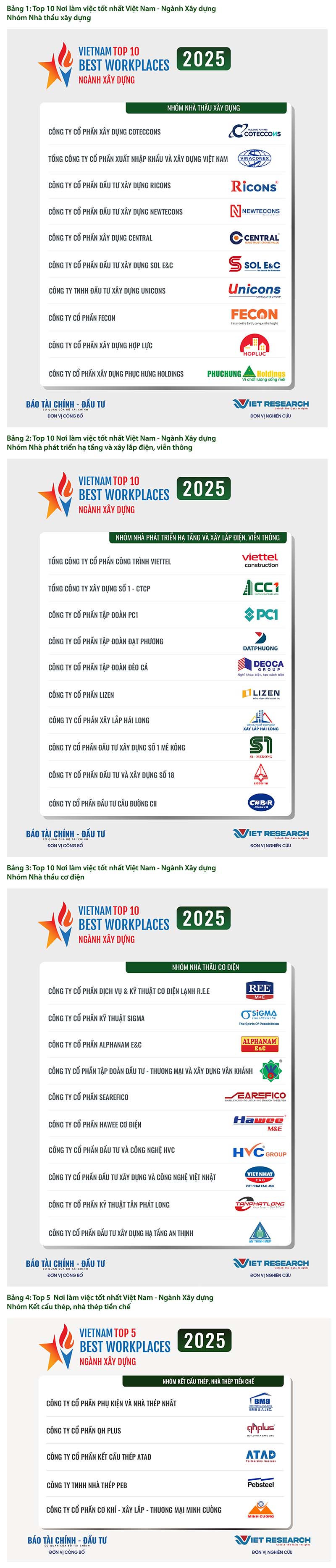 Năm 2025 là năm thứ tư liên tiếp Chương trình Top 10 Nơi làm việc tốt nhất Việt Nam - VBW10 trong các ngành kinh tế trọng điểm được Viet Research và Báo tài chính - Đầu tư (Bộ tài chính) nghiên cứu và công bố. Đây là chương trình thường niên nhằm tìm kiếm và tôn vinh những doanh nghiệp có môi trường làm việc tốt nhất trong các ngành, các doanh nghiệp tuyển dụng hàng đầu Việt Nam, những thành tố quan trọng tạo cơ hội việc làm, góp phần chung vào sự phát triển bền vững của đất nước và nền kinh tế trong giai đoạn mới. Những doanh nghiệp xuất sắc góp mặt trong VBW10 đóng vai trò quan trọng trong việc định hình và nâng cao chất lượng thị trường lao động quốc gia, đóng vai trò dẫn dắt trong việc thúc đẩy trách nhiệm xã hội và phát triển bền vững, tạo ra giá trị lâu dài cho các cổ đông, người lao động, nền kinh tế và xã hội.