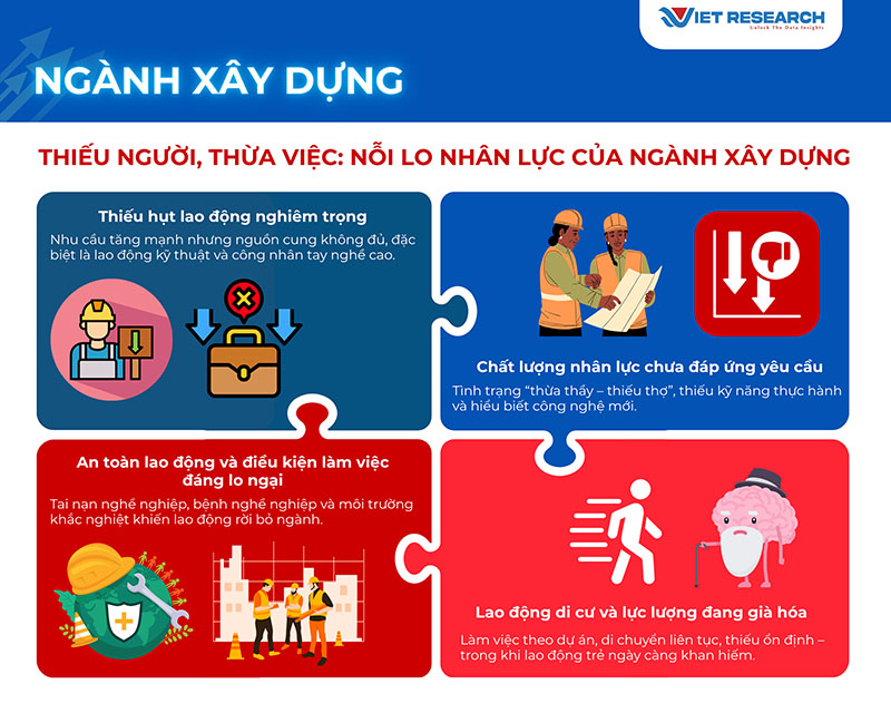 Song song đó là bài toán an toàn và điều kiện làm việc. Ngành Xây dựng nằm trong Top 5 lĩnh vực có tỷ lệ tai nạn lao động chết người nhiều nhất năm 2024, chủ yếu do ngã từ độ cao (45%), vật rơi (28%) và tai nạn máy móc (27%). Theo Bộ Y tế, khoảng 1/4 công nhân xây dựng mắc bệnh phổi mãn tính do tiếp xúc với bụi và hóa chất, trong khi công tác bảo hộ và đào tạo an toàn vẫn còn hạn chế. Môi trường làm việc khắc nghiệt, rủi ro cao khiến nhiều lao động rời bỏ ngành, chuyển sang khu công nghiệp hoặc đi xuất khẩu lao động.