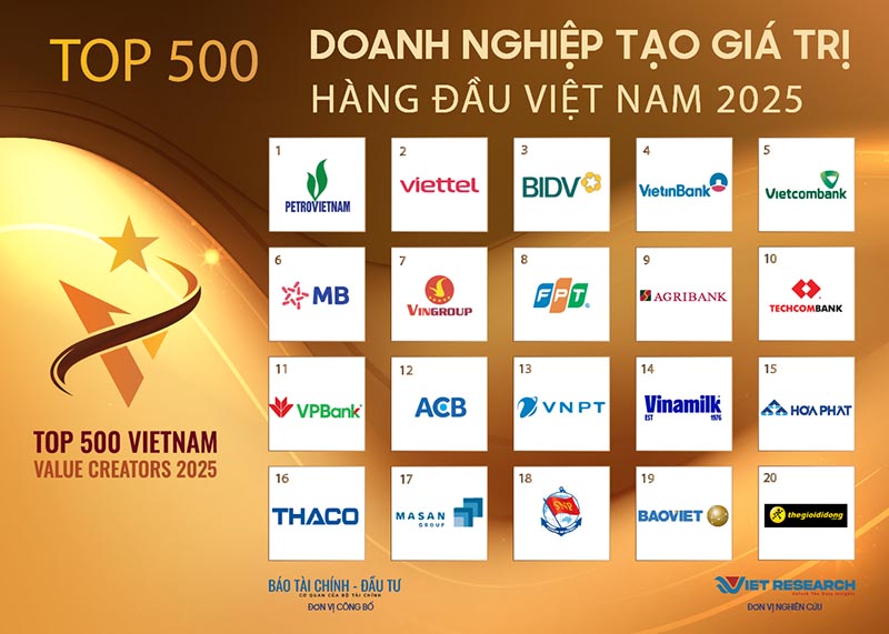 Trong khuôn khổ Chương trình Nghiên cứu toàn quốc về các Doanh nghiệp tạo giá trị hàng đầu Việt Nam, Viet Research phối hợp với Báo Tài chính - Đầu tư (Bộ Tài chính) công bố Top 500 Doanh nghiệp tạo giá trị hàng đầu Việt Nam 2025. Đây là những doanh nghiệp tiên phong trong việc tạo dựng giá trị cho nền kinh tế và xã hội, thể hiện qua: quy mô và tốc độ tăng trưởng; lợi nhuận và đóng góp cho ngân sách; môi trường, chính sách và phúc lợi lao động; cam kết về ESG và đổi mới sáng tạo.