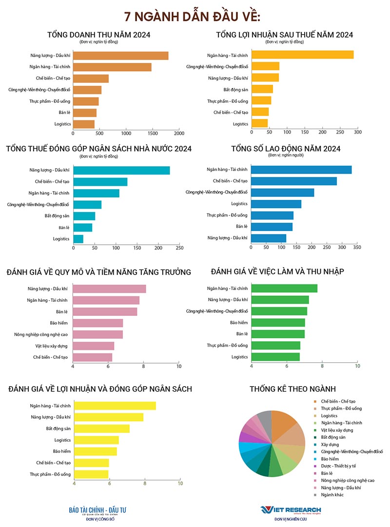 Năm 2025, ngành Năng lượng - Dầu khí tiếp tục giữ vai trò “đầu tàu”, dẫn đầu bảng xếp hạng VALUE500 về quy mô doanh thu với gần 1,8 nghìn tỷ đồng. Đáng chú ý, ngành Ngân hàng - Tài chính đã bứt phá lên vị trí thứ 2, phản ánh kết quả kinh doanh khởi sắc trong năm 2024. Động lực chính đến từ việc mở rộng tín dụng nhờ nới room kịp thời, dòng vốn tín dụng tăng trưởng ổn định cùng sự bùng nổ của dịch vụ ngân hàng số và thanh toán không tiền mặt, giúp gia tăng đáng kể nguồn thu phí. Theo sau là ngành Chế biến - Chế tạo và ngành Công nghệ - Viễn thông - Chuyển đổi số.