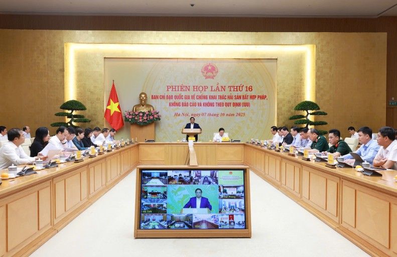Thủ tướng Phạm Minh Chính chủ trì Phiên họp lần thứ 16 Ban Chỉ đạo Quốc gia về chống khai thác hải sản bất hợp pháp, không báo cáo và không theo quy định (IUU). Ảnh: VGP. |