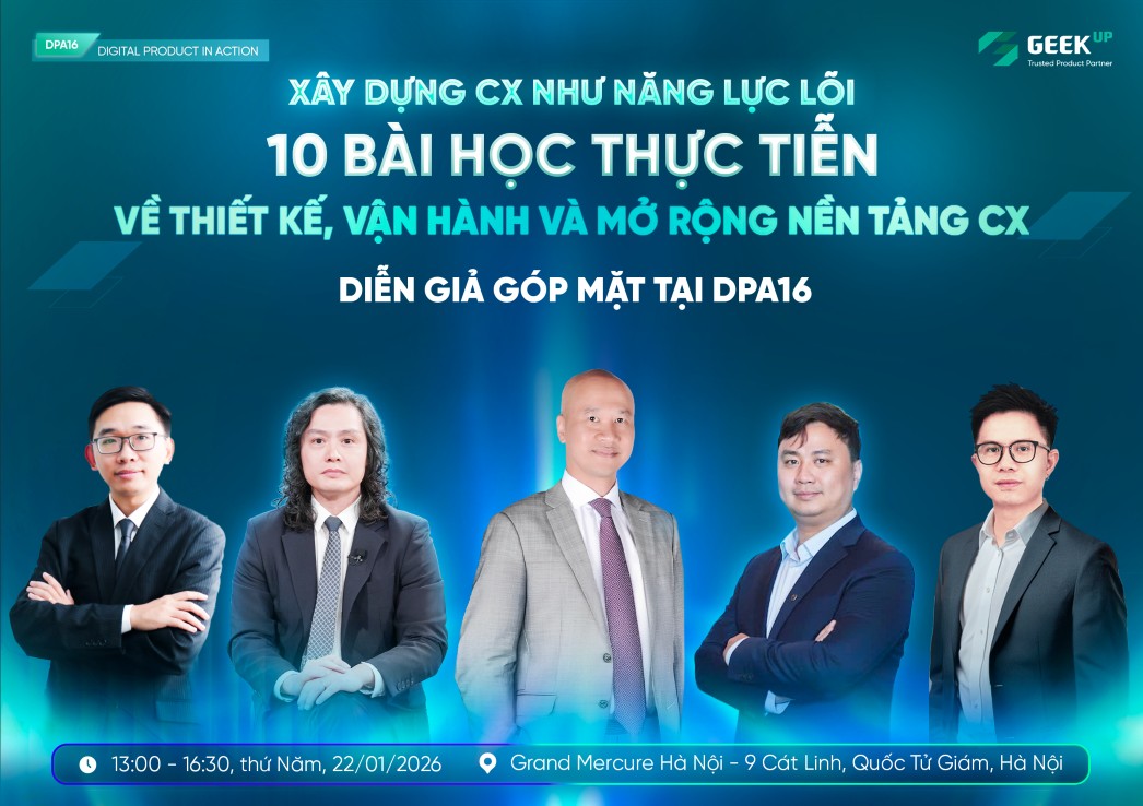 | DPA16 - hội thảo thuộc chuỗi Digital Product in Action do GEEK Up tổ chức - tập trung vào bài toán cân bằng ba yếu tố công nghệ - người dùng - vận hành trong CX Platform ngành Tài chính - Ngân hàng. |