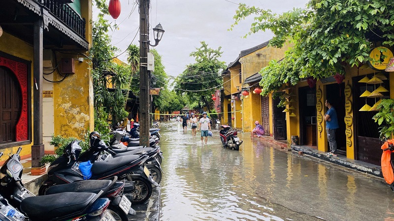 | Mực nước sông Hoài (một nhánh của sông Thu Bồn) liên tục dâng cao, gây ngập sâu một số tuyến đường ở phố cổ Hội An. |