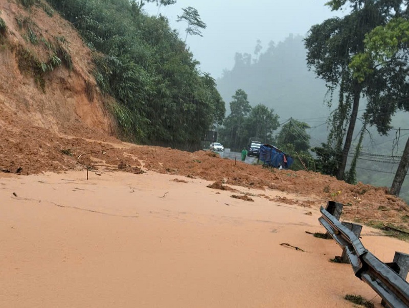 | Mưa lớn gây sạt lở đường QL 40B tại ngã ba Trà Giác xã Trà Tân, Đà Nẵng. Ảnh: H.H |