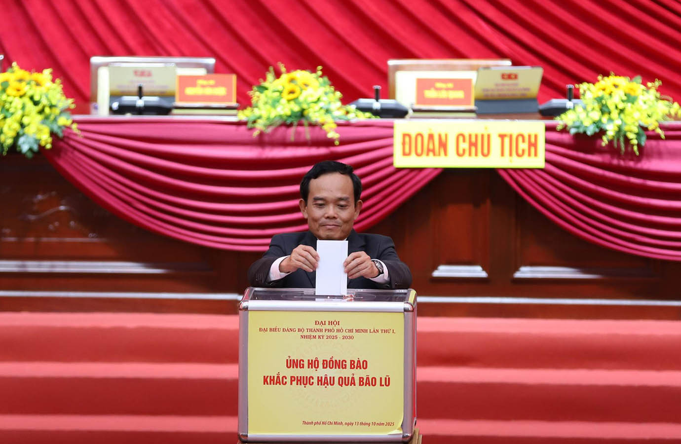 Các đại biểu dự Đại hội Đảng bộ TP.HCM nhiệm kỳ 2025 - 2030 tham gia đóng góp ủng hộ đồng bào khắc phục hậu quả bão lũ. Ảnh: BTC |